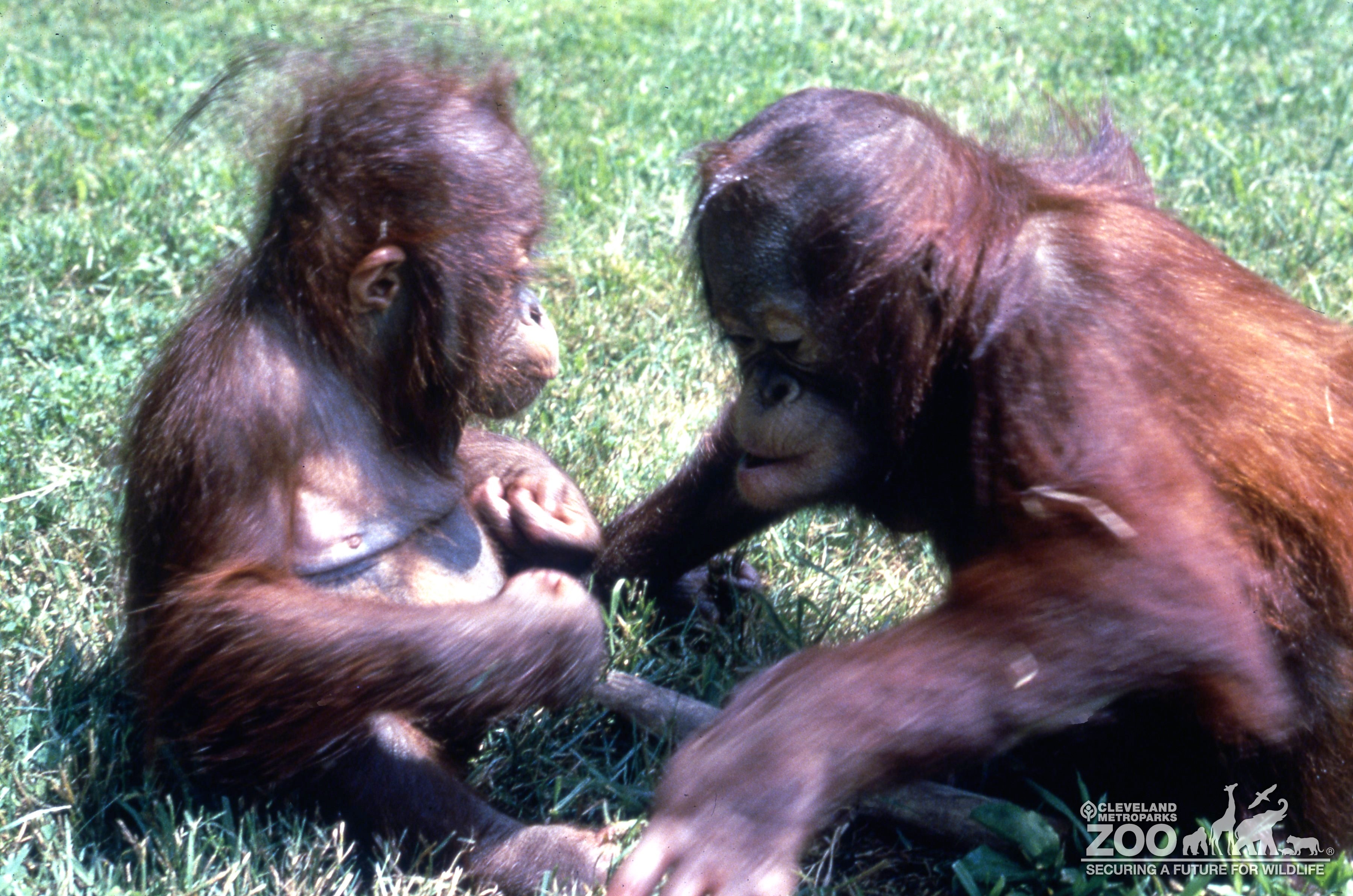 Two younger orangutan sitting in a grassy field. The orangutan on your left is much younger than the one on the right. Primates are facing each other. Both have dark reddish brown hair.