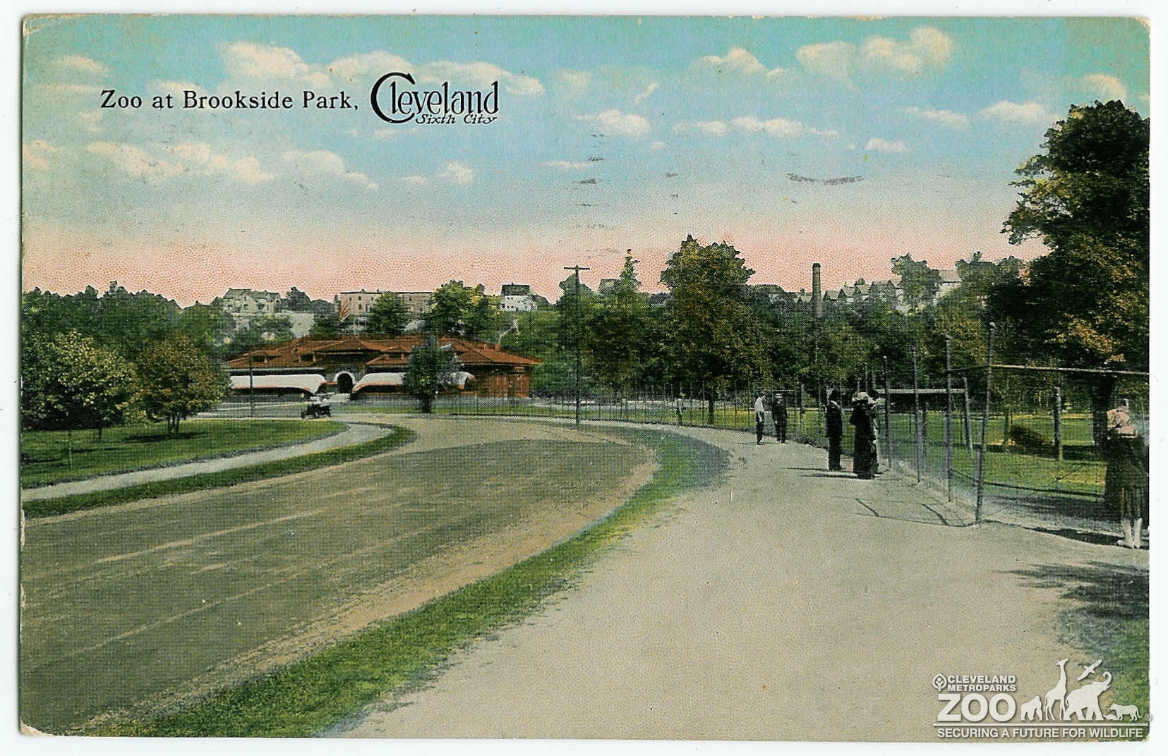 A postcard from the Zoo at Brookside Park, Cleveland. Showing pathway to main building from a distance. Postcard shows muted colors. From 1909.