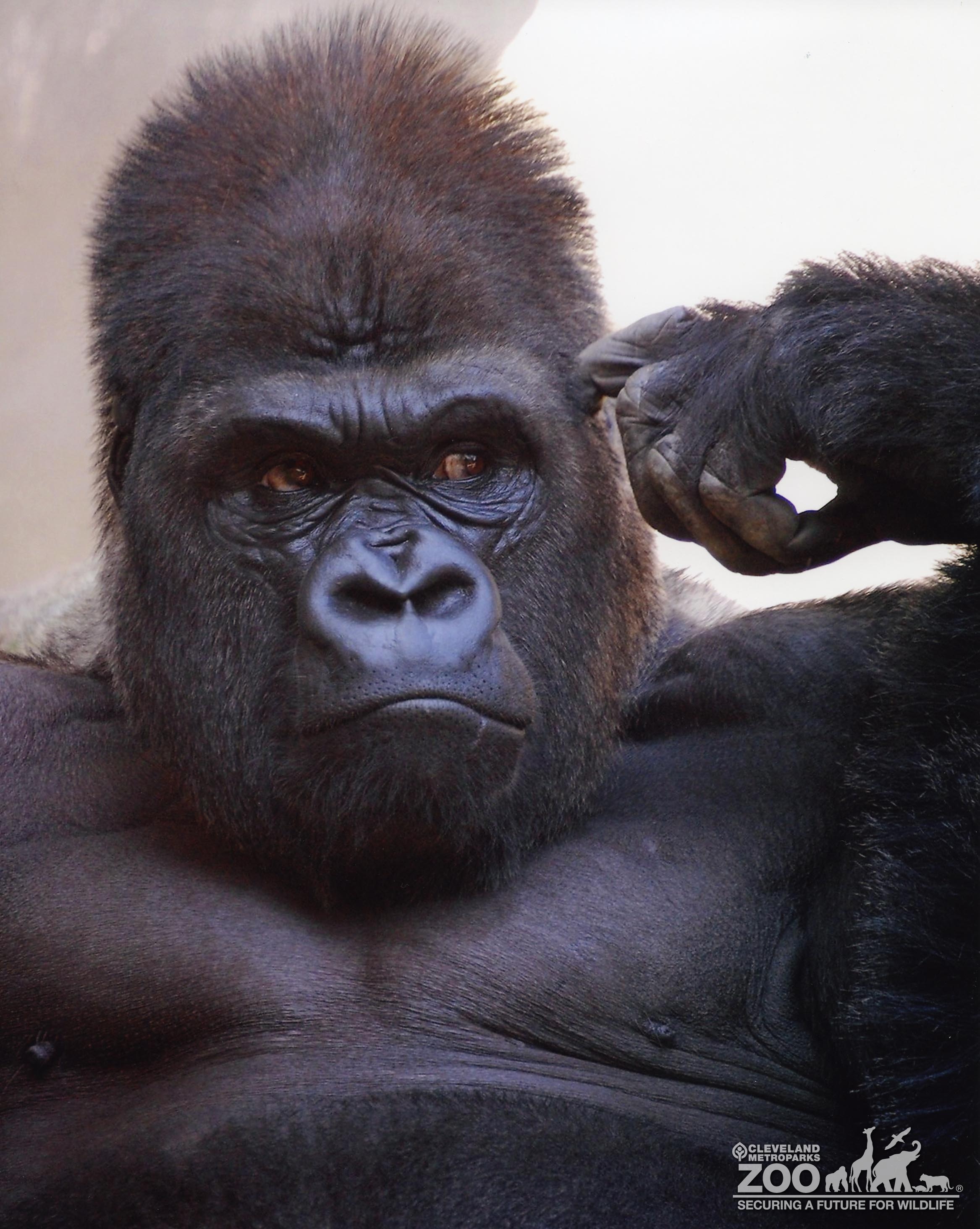 Male gorilla scratching side of head looking to right. Massive chest in view.