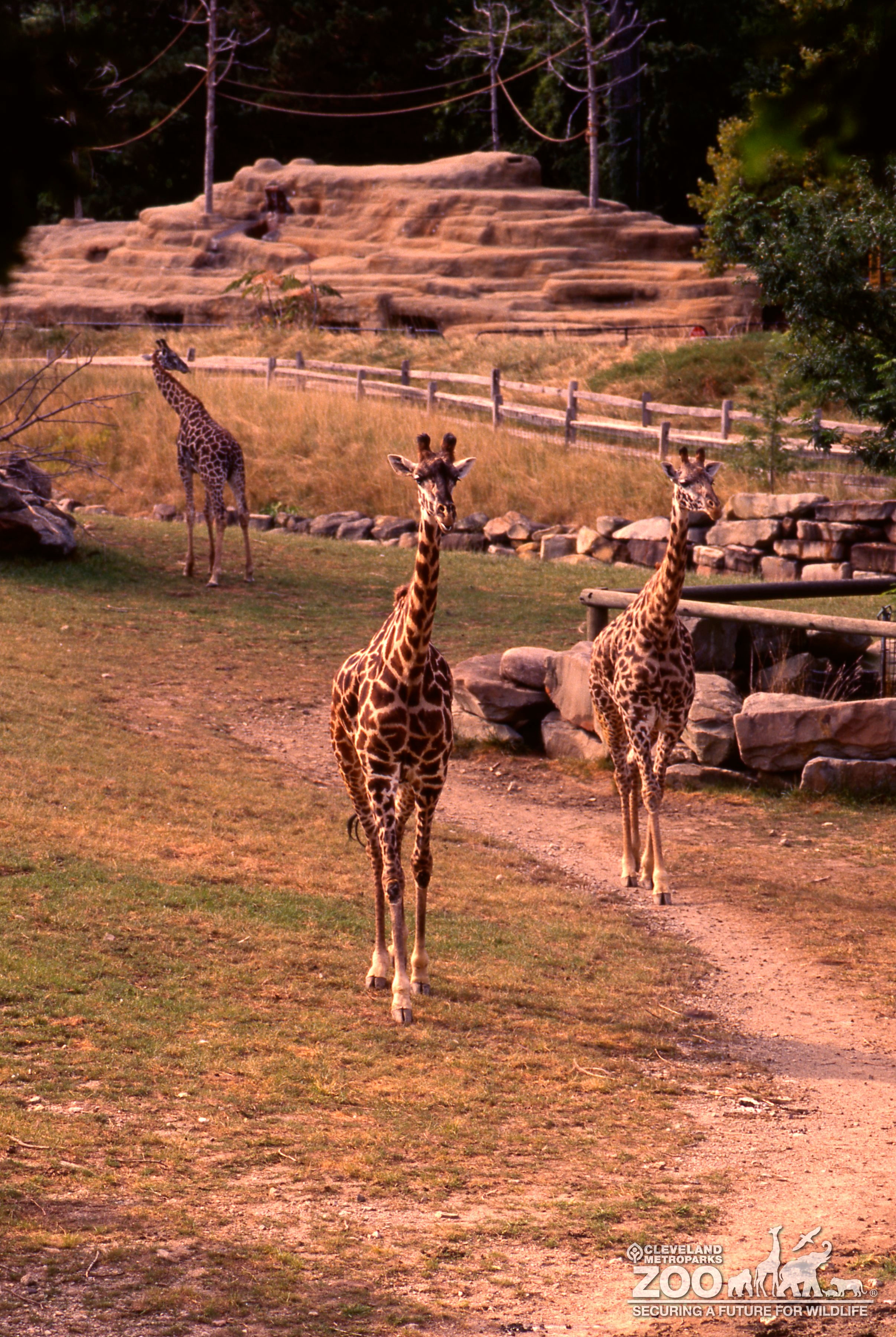 Three Masai giraffe in African savanna yard. Two are walking forward. The grass is brown from the summer heat. Monkey island is in the background. Low rock walls and wood fence are in view.