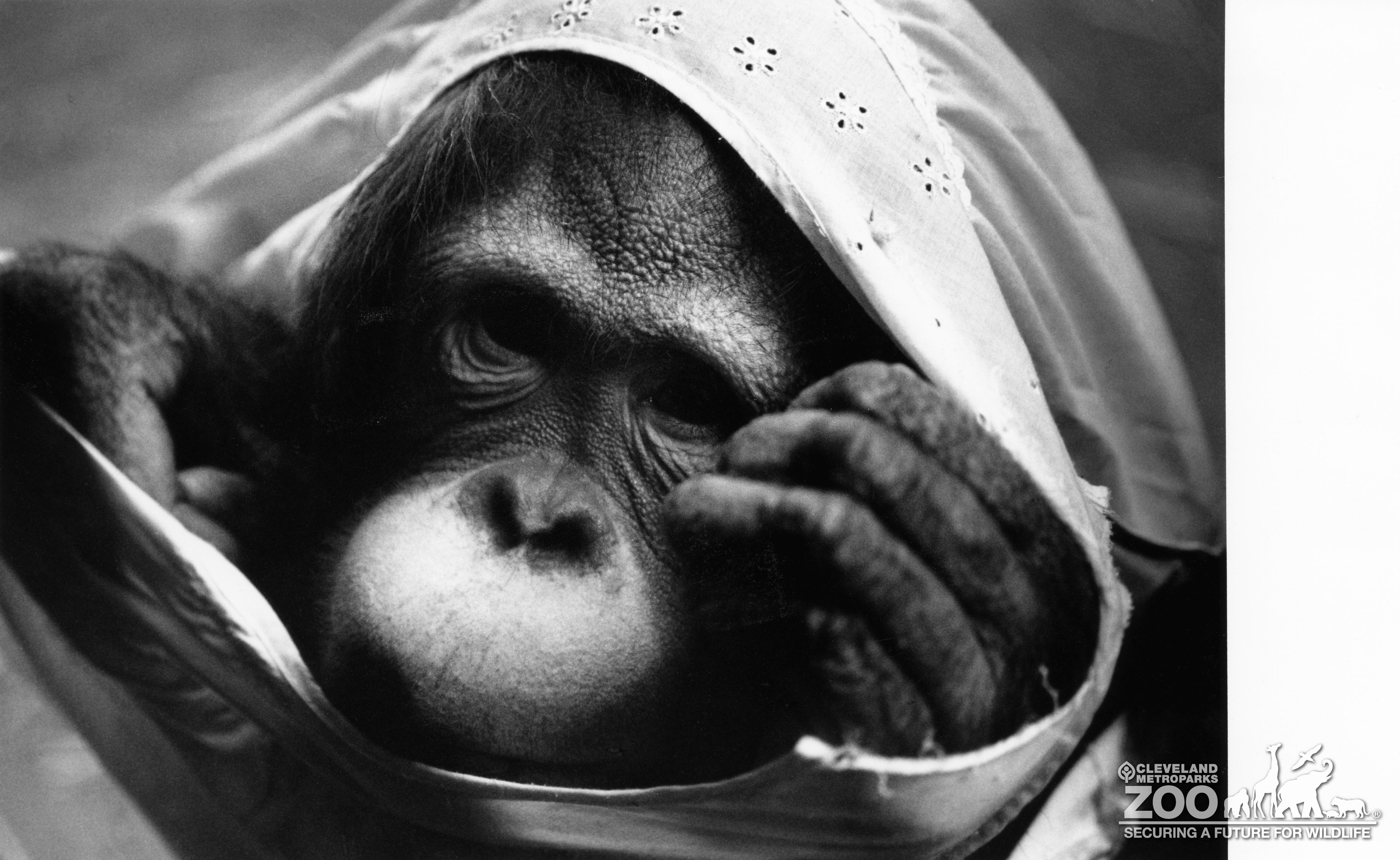 Orangutan peeking out of a cloth sack or shirt. Image is black & white.