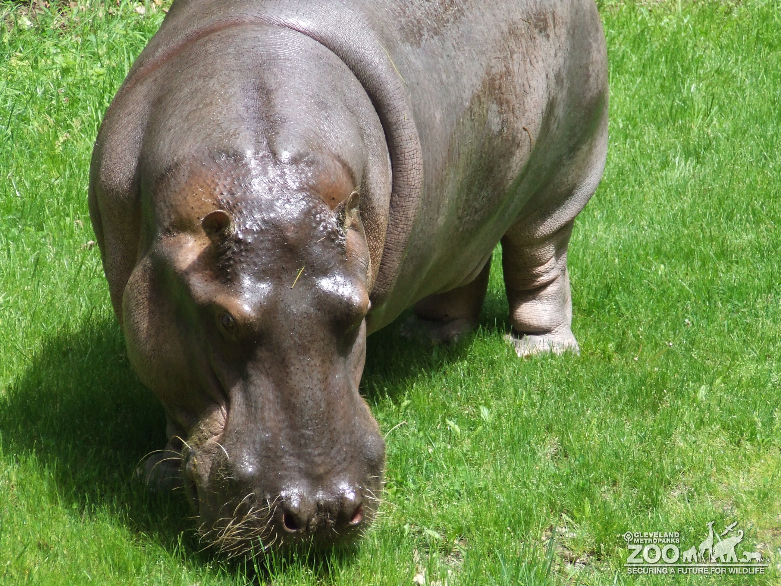 Nile hippo, Blackie outside grazing on green grass in his habitat. View is hippo facing forward and showing massive head and body.