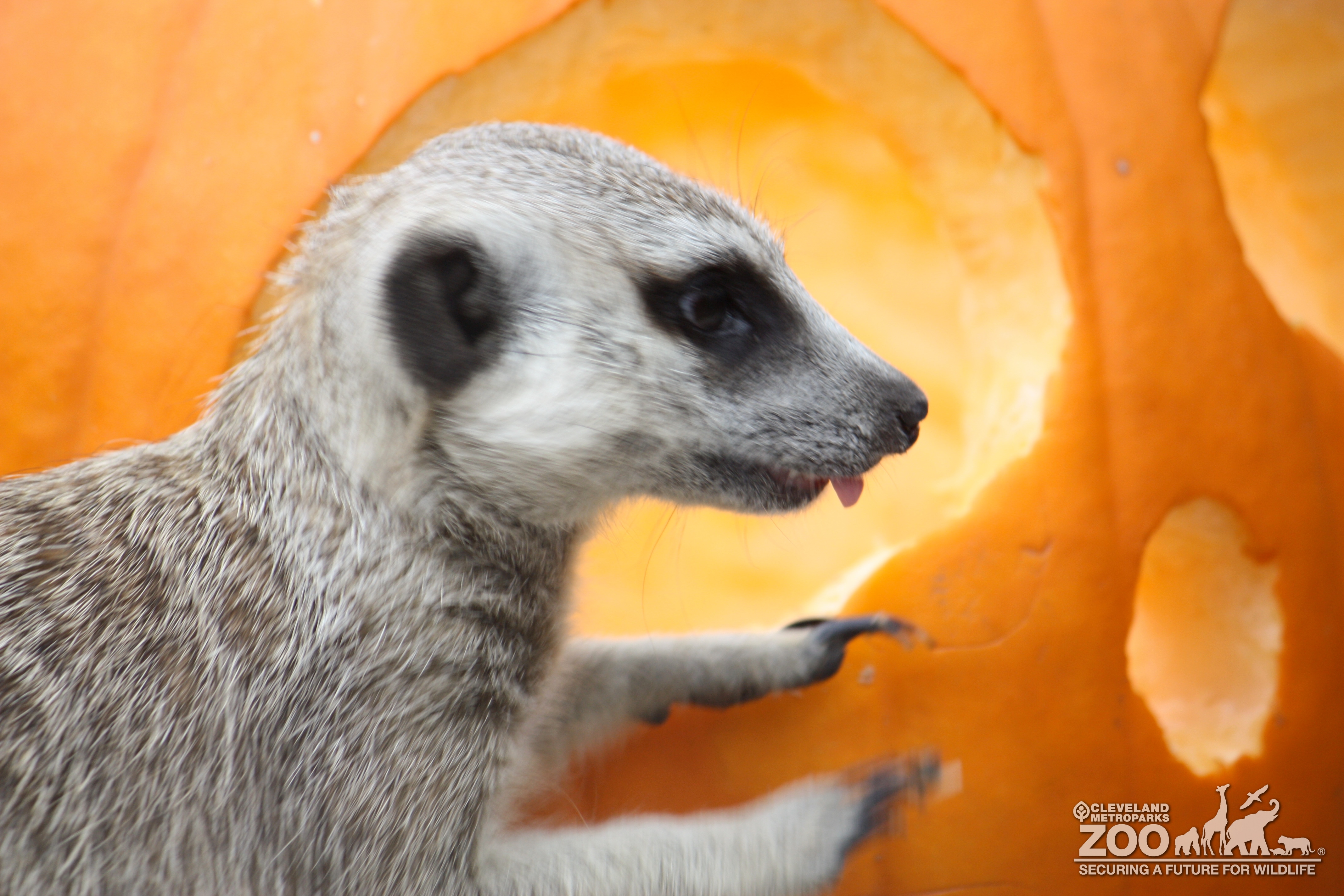 Meerkat with shades of gray faces right in front of pumpkin with three holes carved in it. Focus on meerkat's face in profile with black ear and black around eye, tongue sticking out and left paw on pumpkin and right paw in motion.