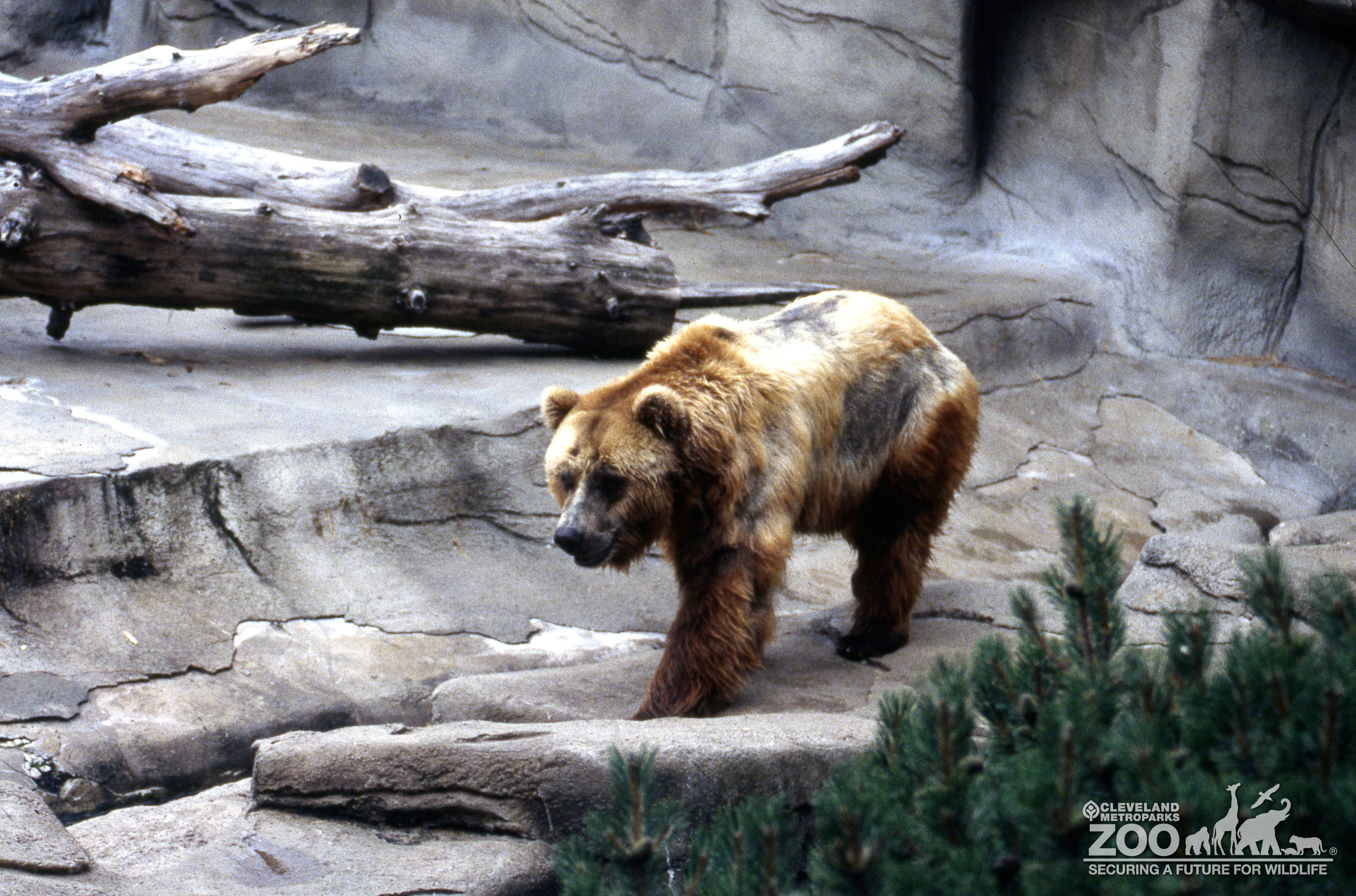 This Grizzly Bear is walking through it's outdoor enclosure. The ground and walls of the enclosure are rocky and grey, there are two large grey logs in the background with a green pine tree in the foreground. The bear is covered in reddish brown fur with patches of blond fur on it's back.