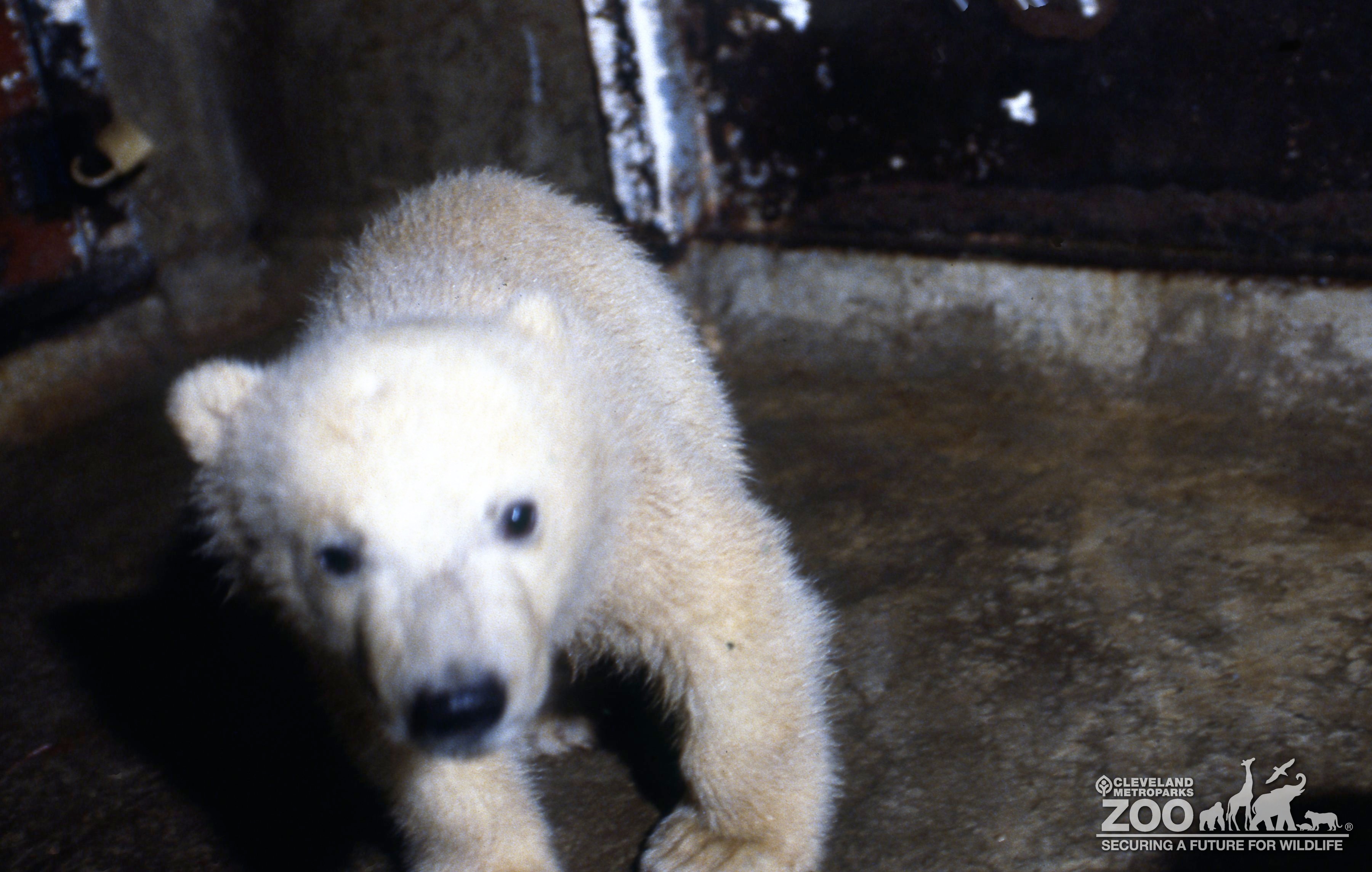 The Polar Bear cub in this photo is walking right up to the camera. It is walking on the brown muddy of its indoor enclosure. The cub is covered in white fur, has round ears, dark eyes, and black nose.