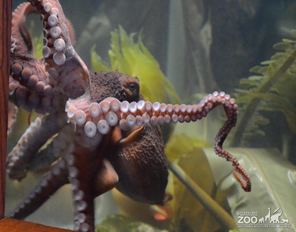 Giant octopus in tank moving around. View is of arms and tentacles. Octopus is rust colored. Suckers are on glass.