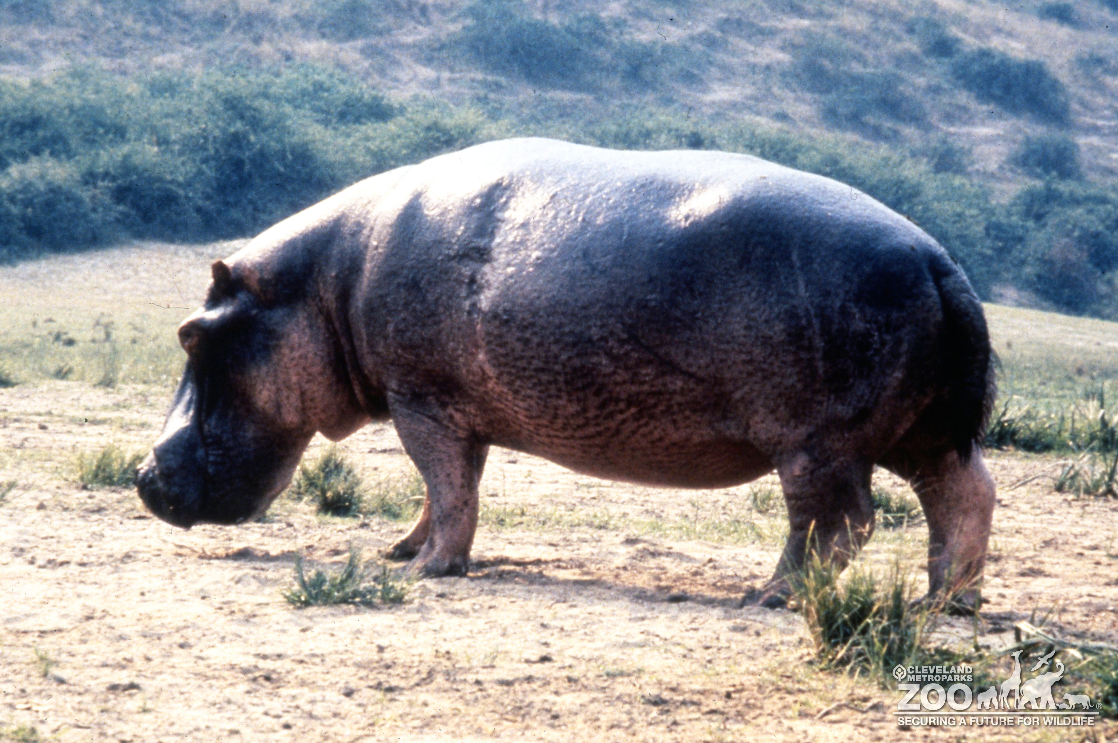 Nile hippo, in the wild, eating on the savanna. Shows large massive body taken from the side. Shrubby hillside in the background.
