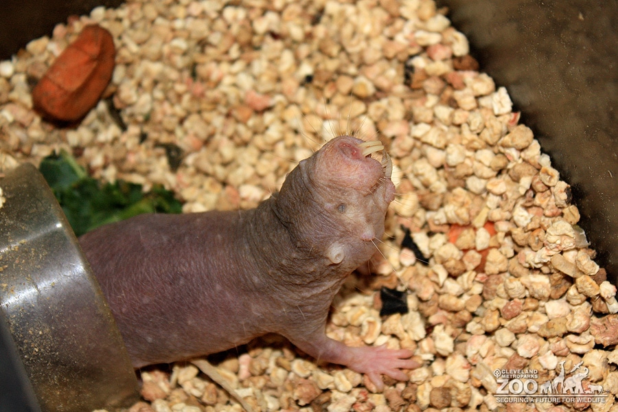 Naked mole-rat emerging from tunnel. This hairless pink wrinkly rodent these in groups similar to ants. Small tan gravel is in the image too.
