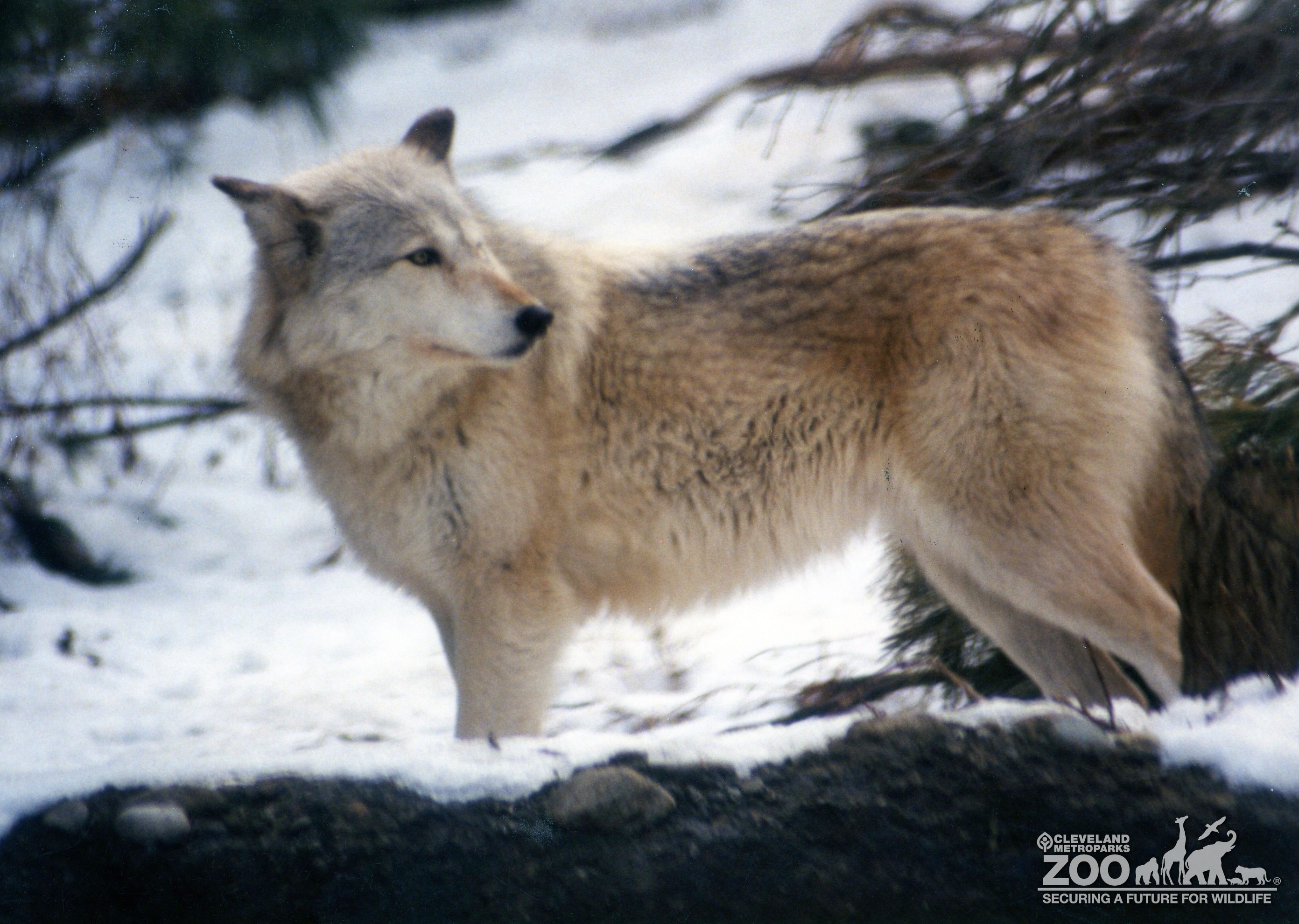 Photo shows a Mexican Gray Wolf standing in snow looking to the right.