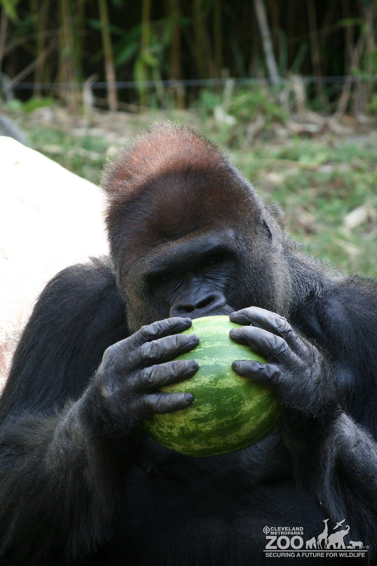 Gorilla with small watermelon up to its mouth. The massive hands are grasping each side of the round watermelon. Gorilla is outside behind the Primate, Cat & Aquatics building.
