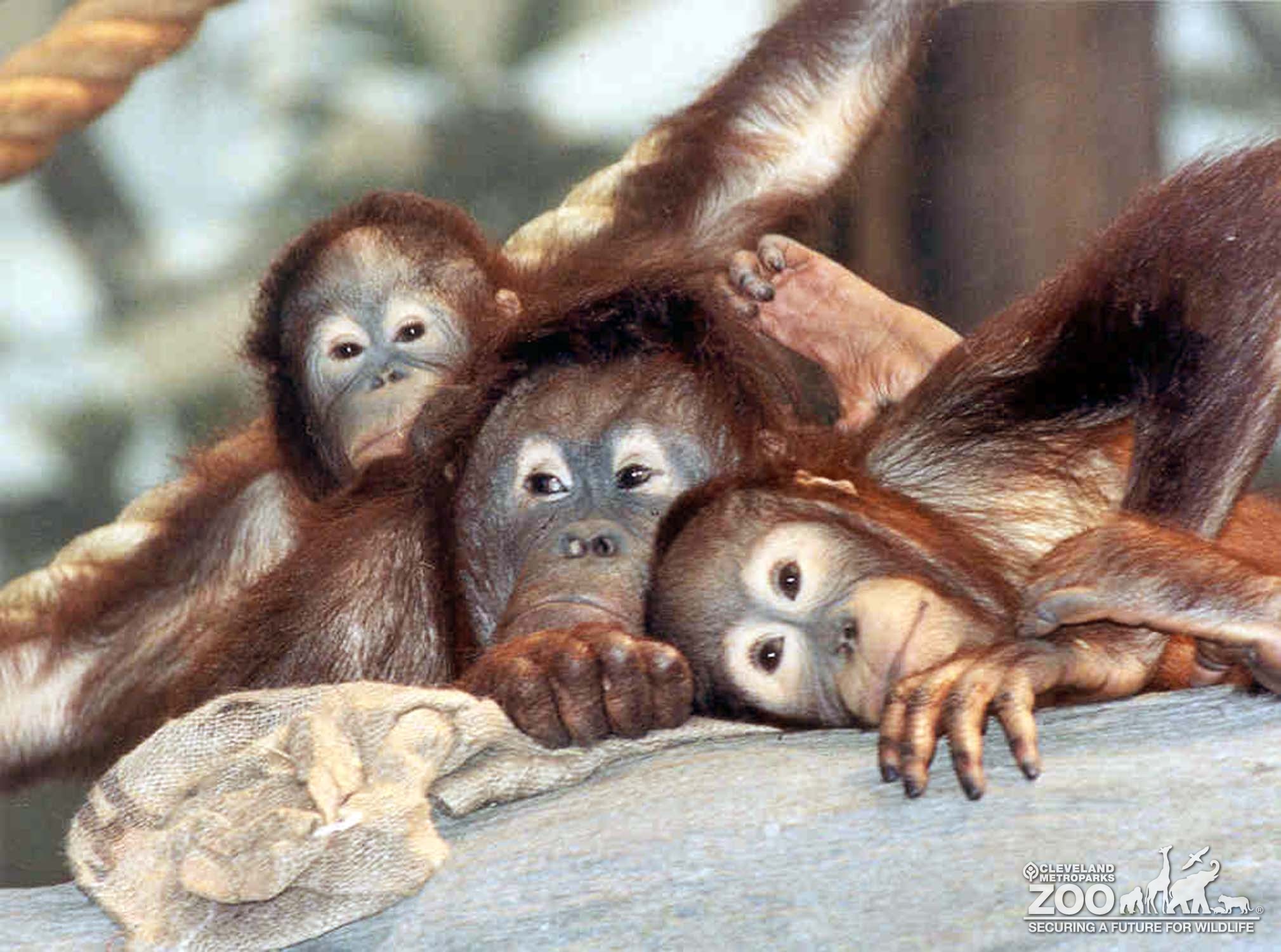 Orangutan grouping two younger and one adult. Their three faces are close together. They are in The RainForest.