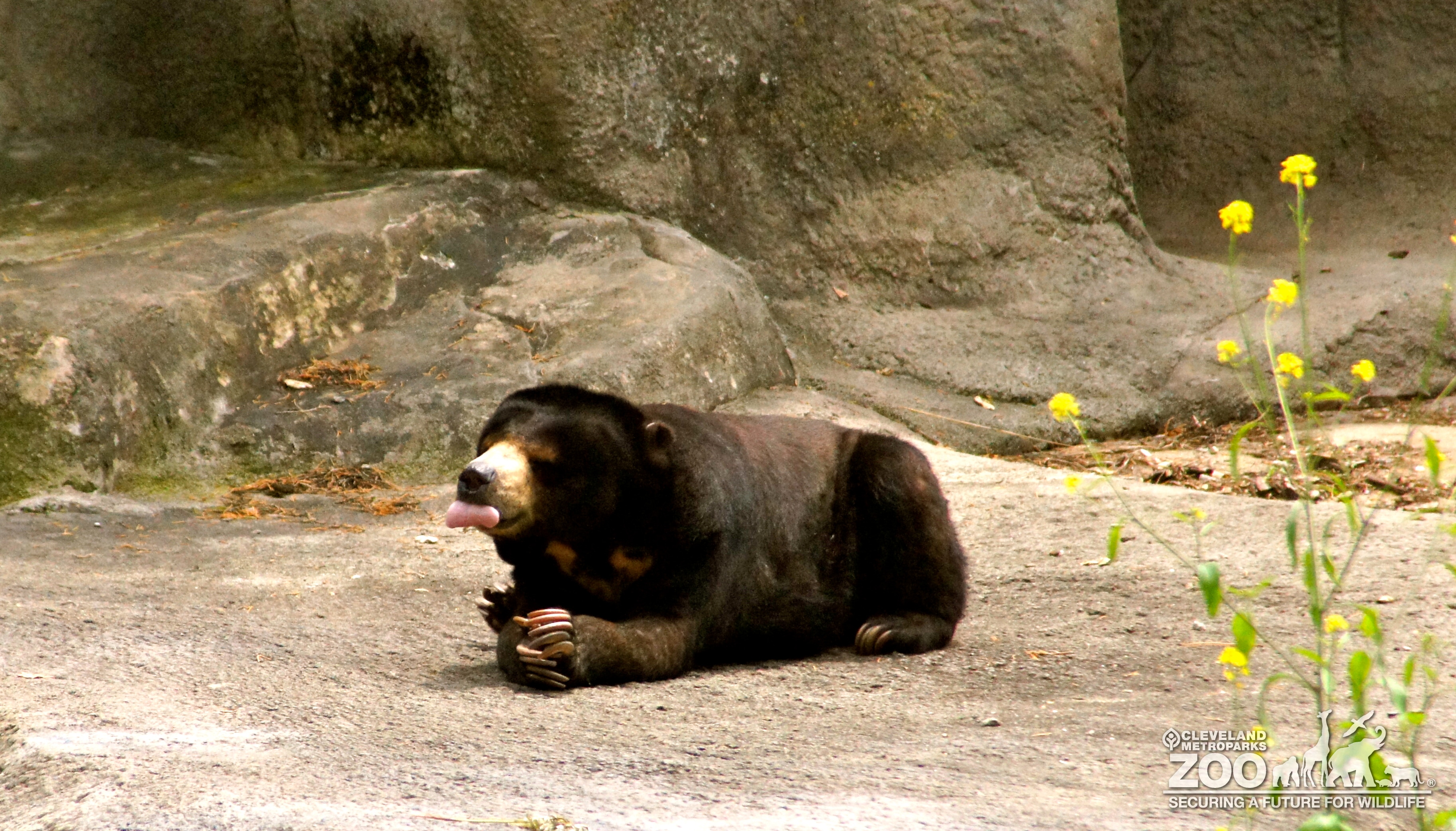 This Malaysian Sun Bear is laying on the grey rocky ground of it's outdoor enclosure with it's tongue sticking out. It is looking off to the right with it's front paws folded in front of it. The bear is covered in short black fur with light brown fur around it's chest and muzzle.
