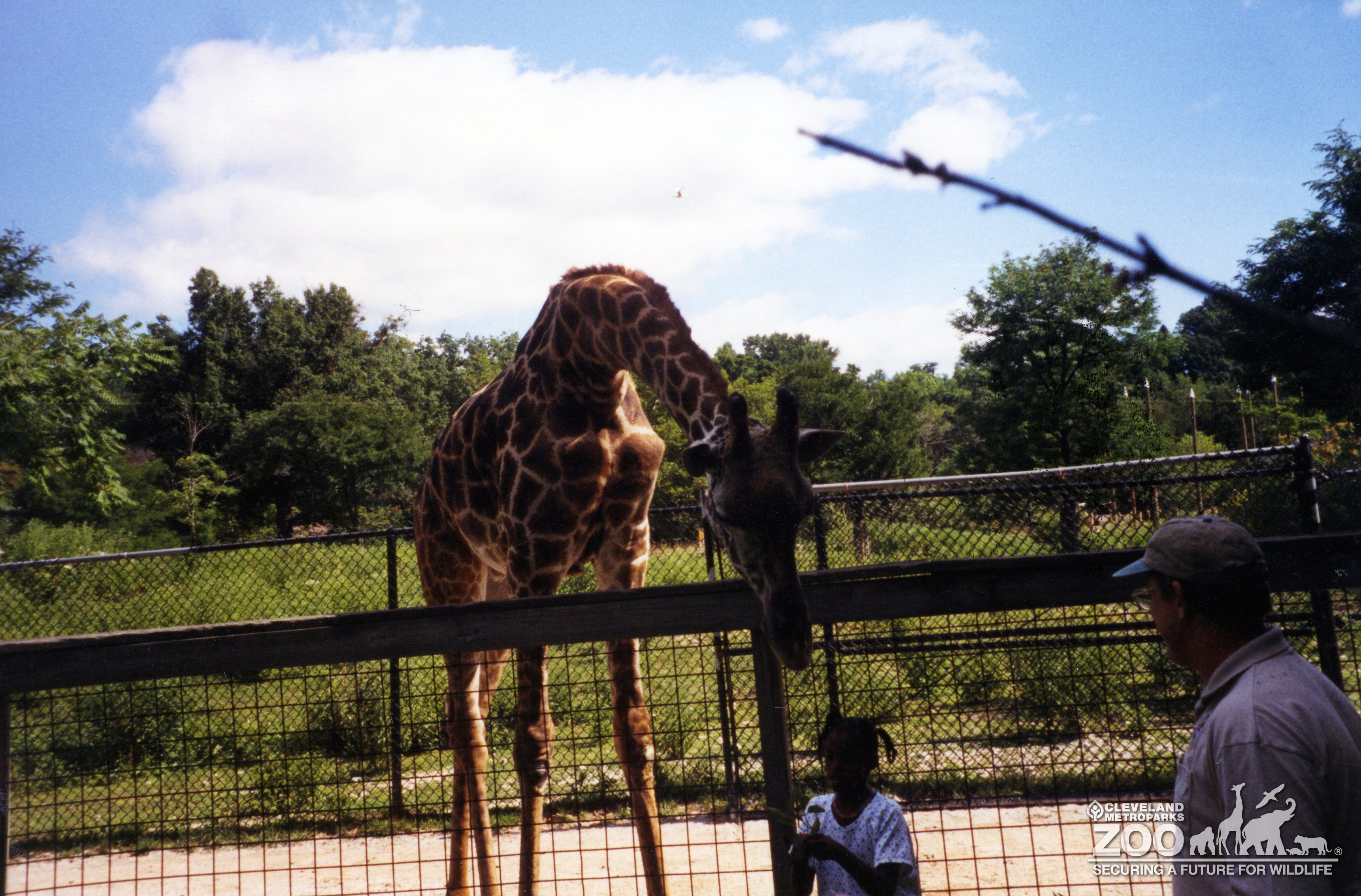 Adult Masai giraffe using its long neck to bend over a fence to be fed by a child. The keeper is near by watching. It is a sunny day with blue sky in the background.