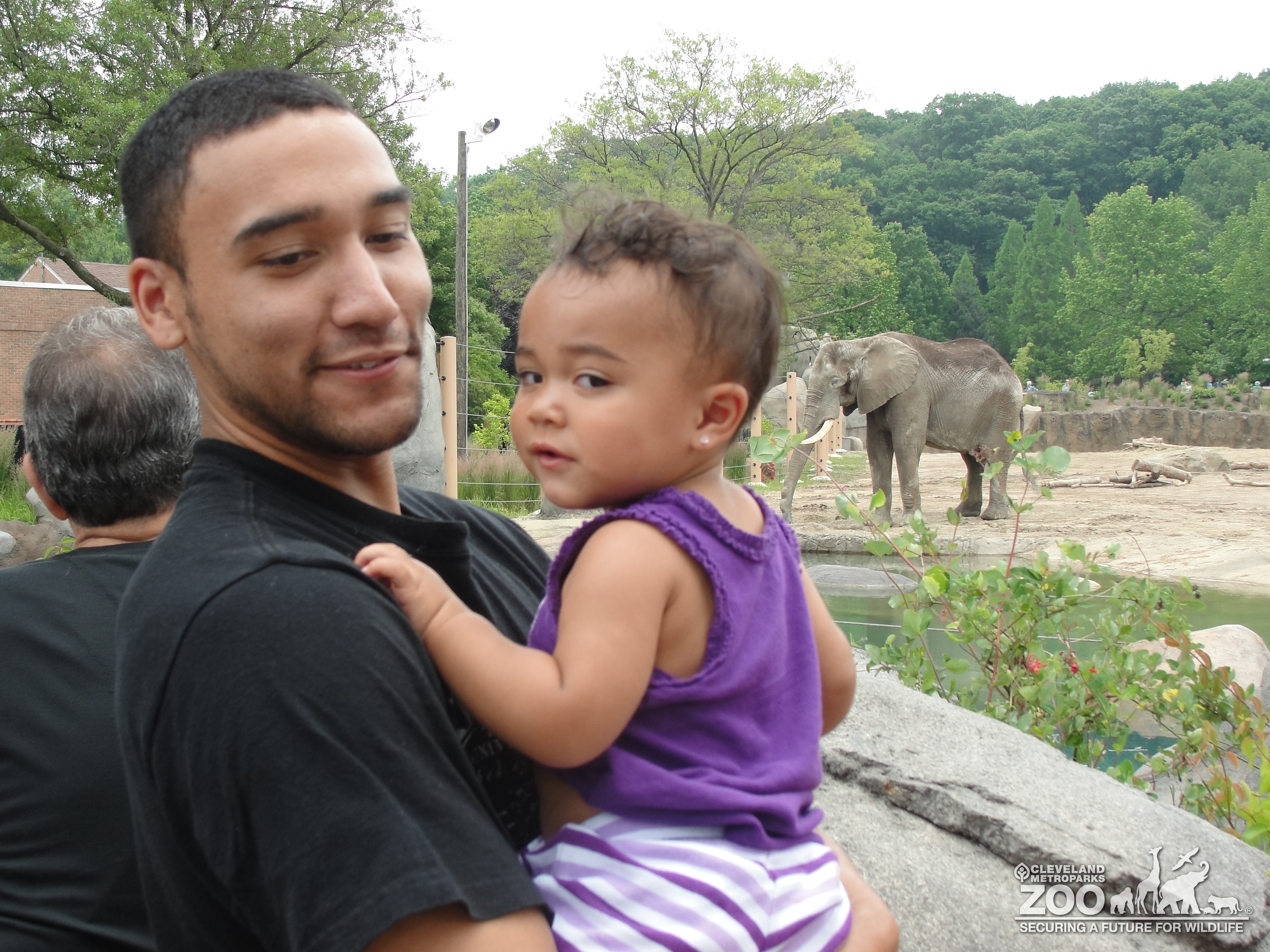 Father and child standing near elephant habitat.