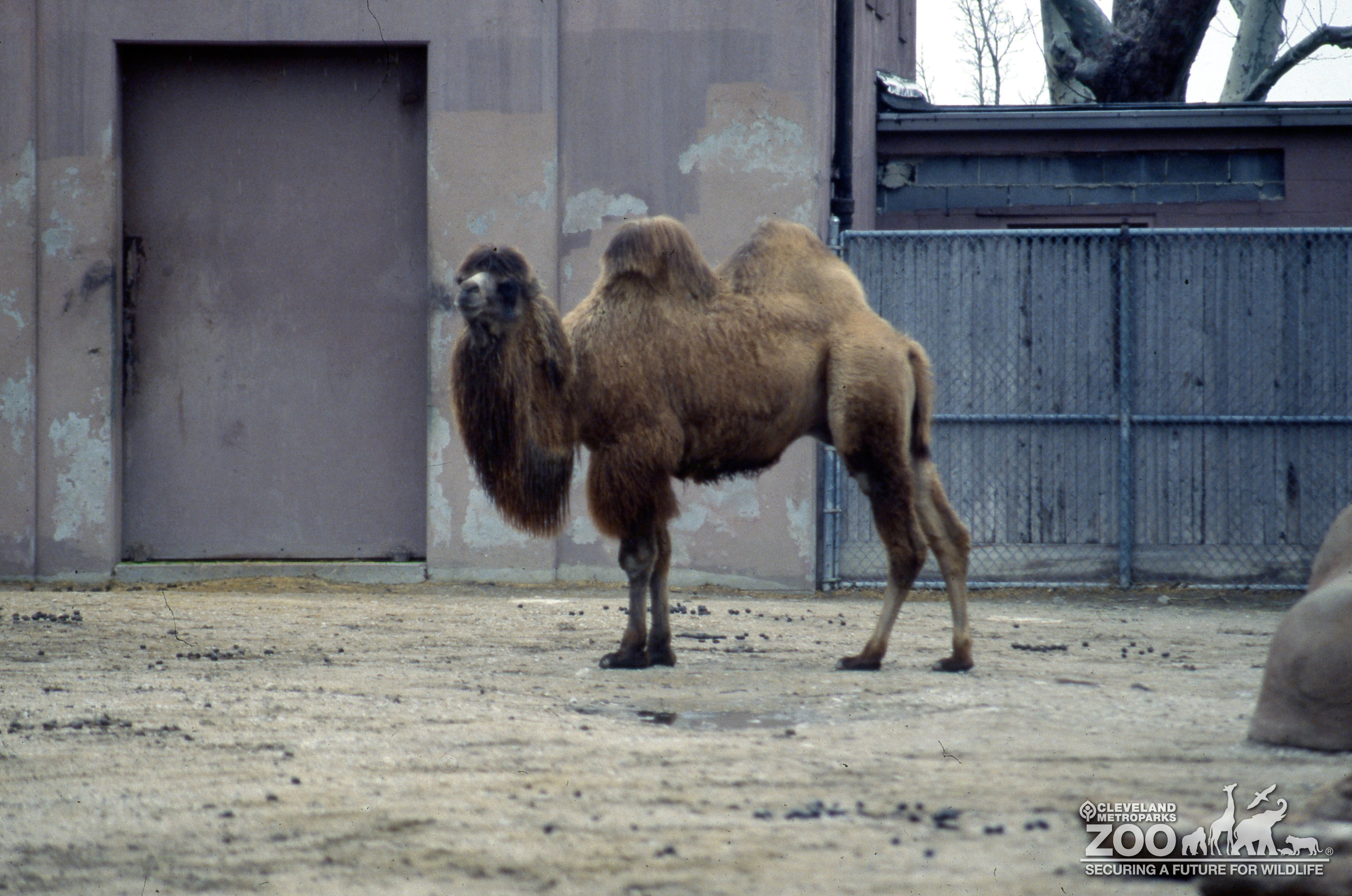 A view of the left side of a Camel standing in its outdoor enclosure looking towards the camera. From its head down to the two large humps in middle of its back, the camel is covered in light brown fur. Down its neck, the camel has long dark brown fur hanging down to its knees.