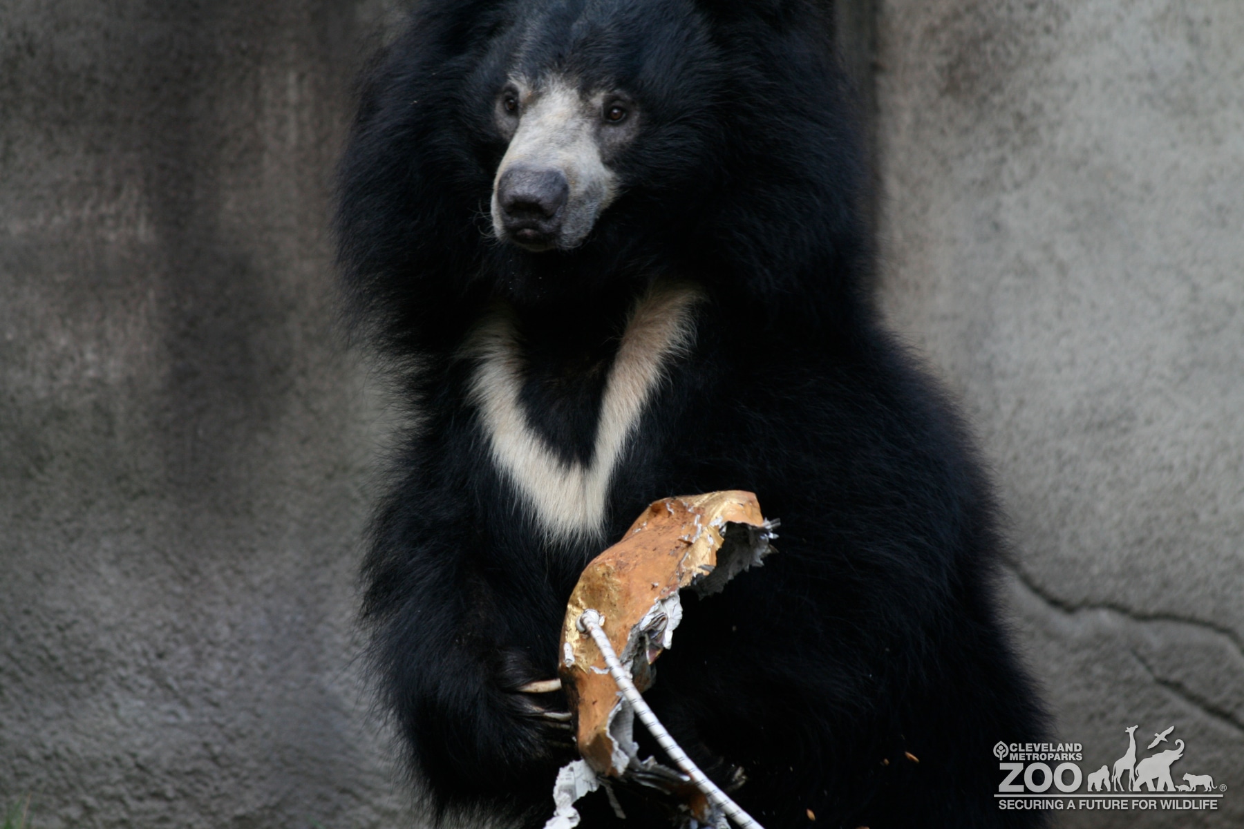 This Sloth Bear sitting in its outdoor enclosure holding the remains of a reddish brown paper mache boulder it was playing with for enrichment. It is looking towards the camera and holding a brown chewed up canvas ball in its front paws. The bear is covered in long black fur with light grey fur on its muzzle and a single curved stripe across its chest.