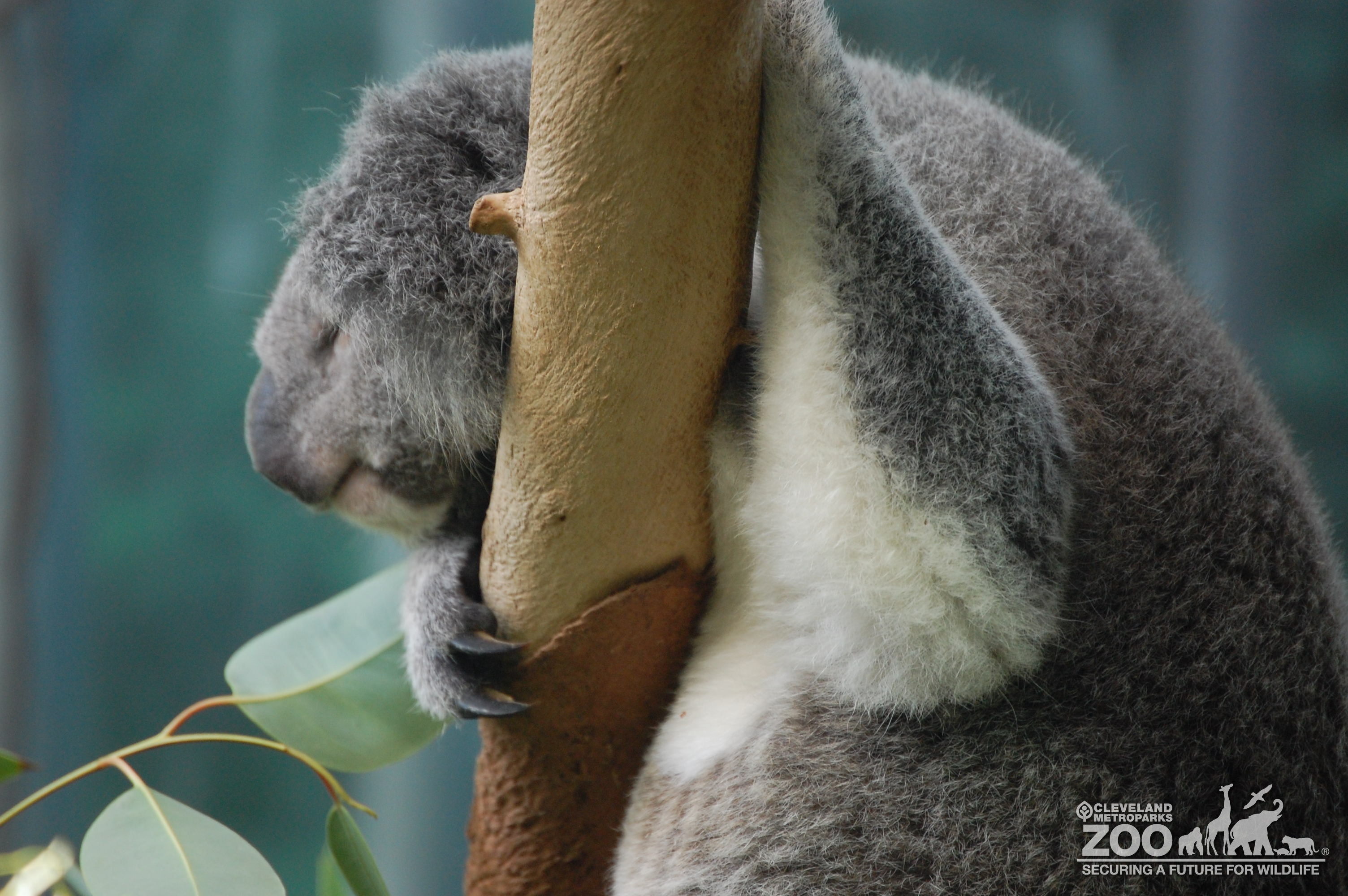 Koala holding on to vertical branch. Wrapped around the branch are its long sharp claws. Animal is facing to the left.