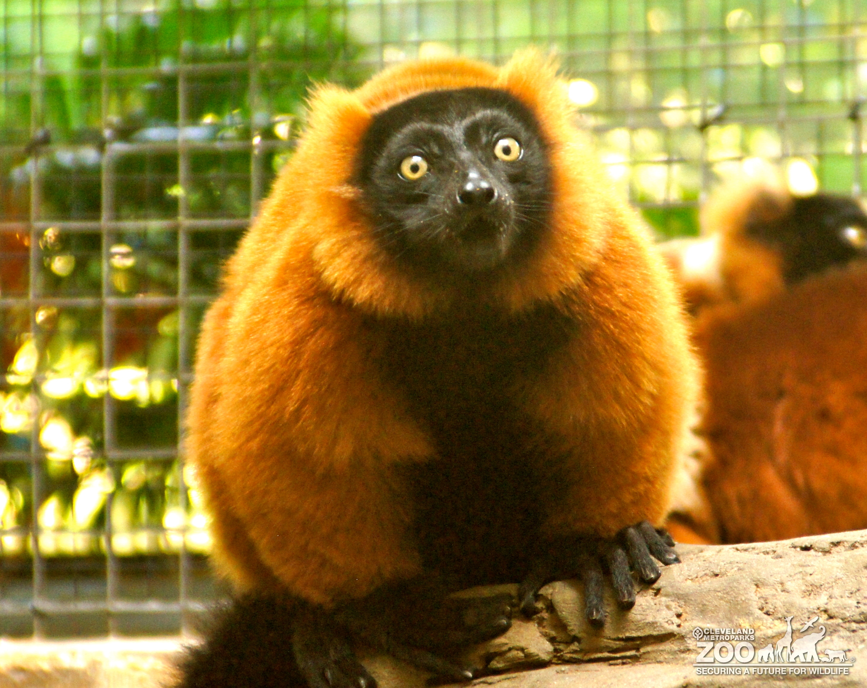 Red-ruffed lemur has a surprised expression on its face. Light in the habitat makes its reddish brown fur glow.