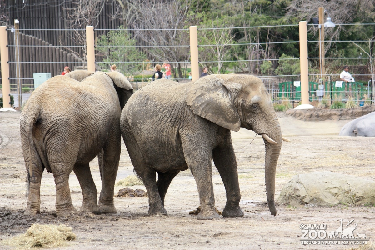 Elephant with shades of gray and brown faces right in center of photograph. Another elephant facing away from the camera stands behind the other elephant on the left side of the photograph.