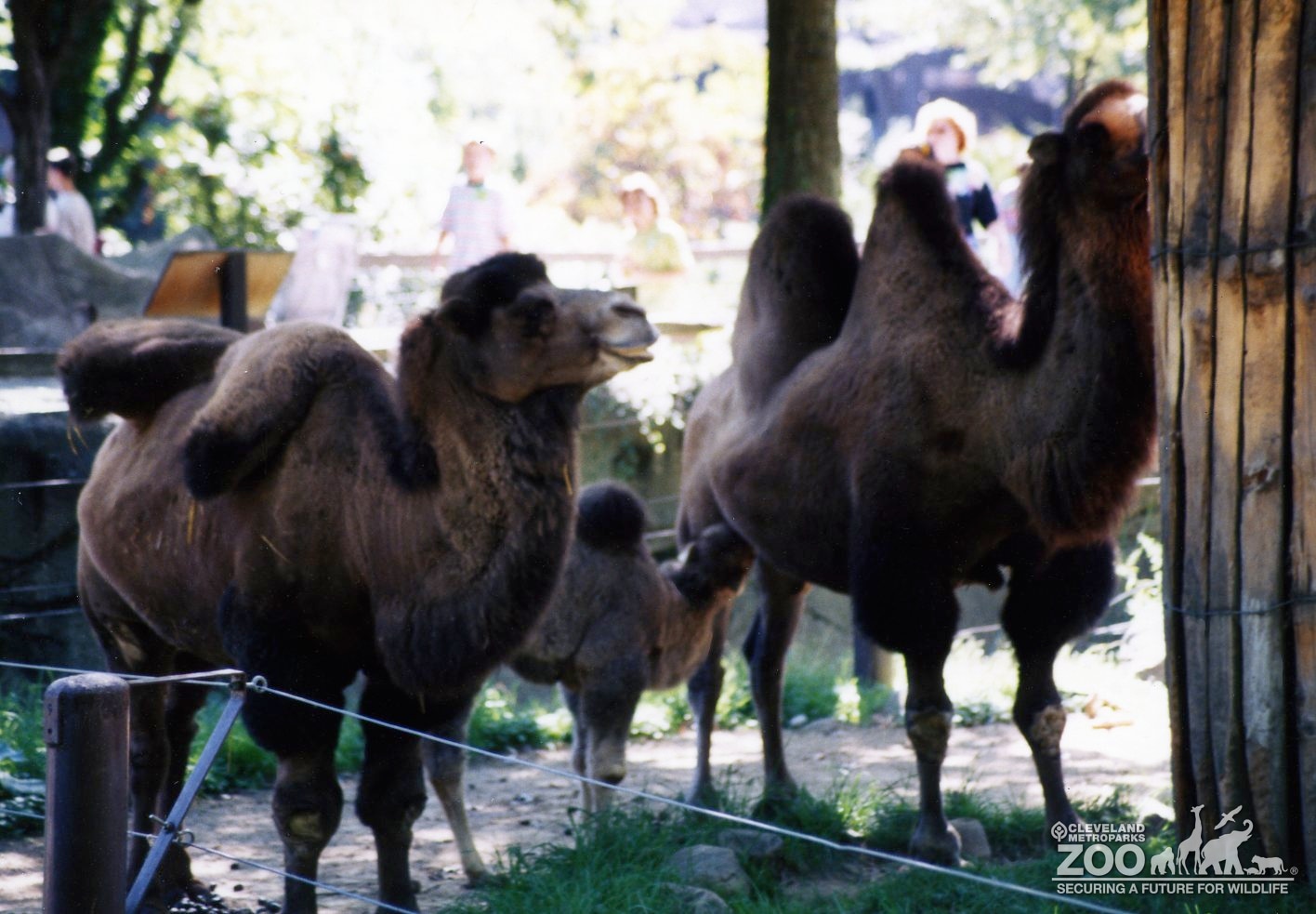 Three Camels, two adults and a baby, standing in the shade of their outdoor enclosure. They are all covered in dark brown fur with large humps on their back. The baby is sniffing the belly of one of the adults while the adults are staring at the bundle of small vertical logs at the center of the enclosure.
