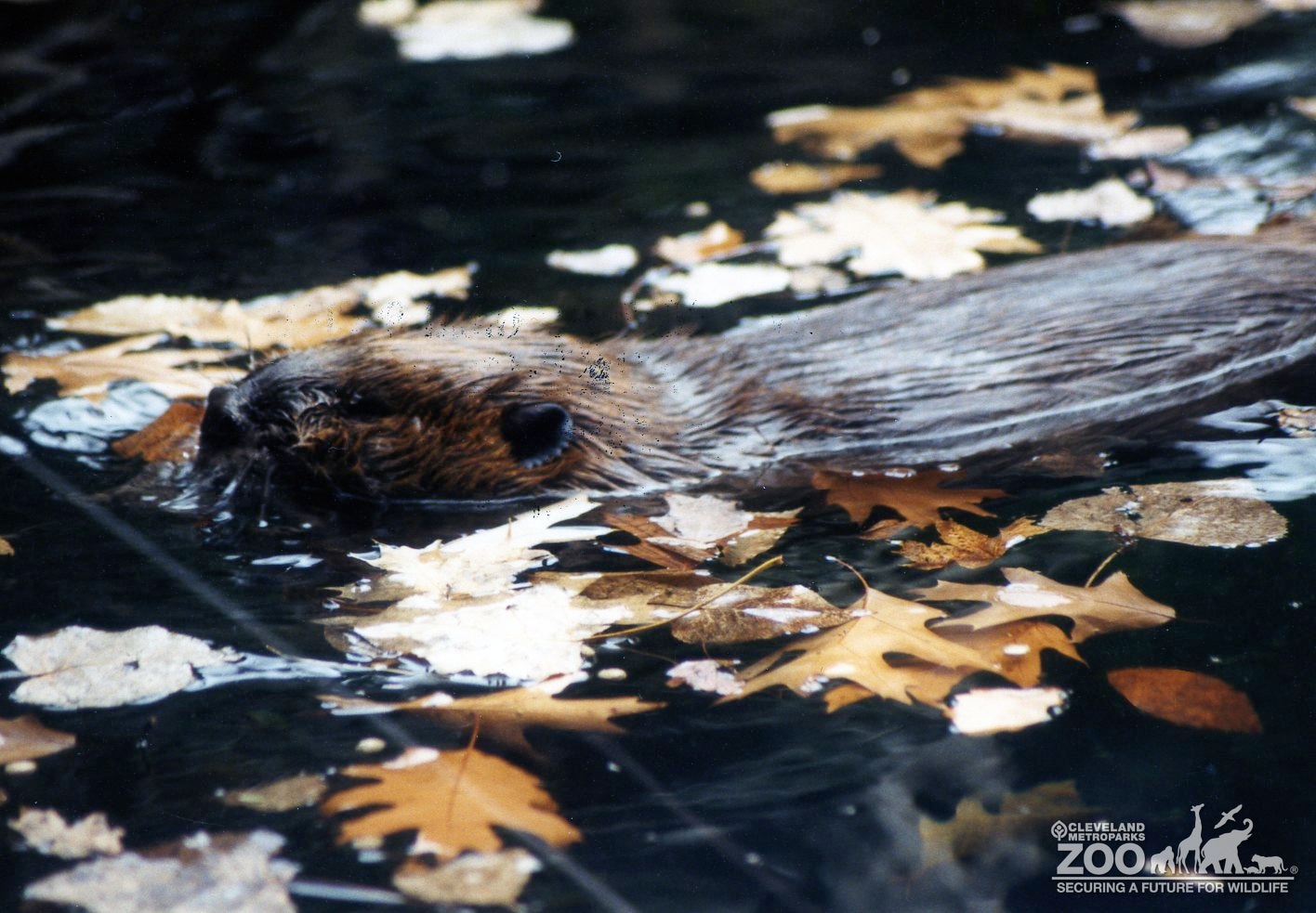 This beaver is swimming through clear water filled with leafs with all but its head and back submerged. The beaver looks similar to a rodent and is covered in reddish brown fur. It has a large brown nose, long whiskers, and short black ears on either side of its head.