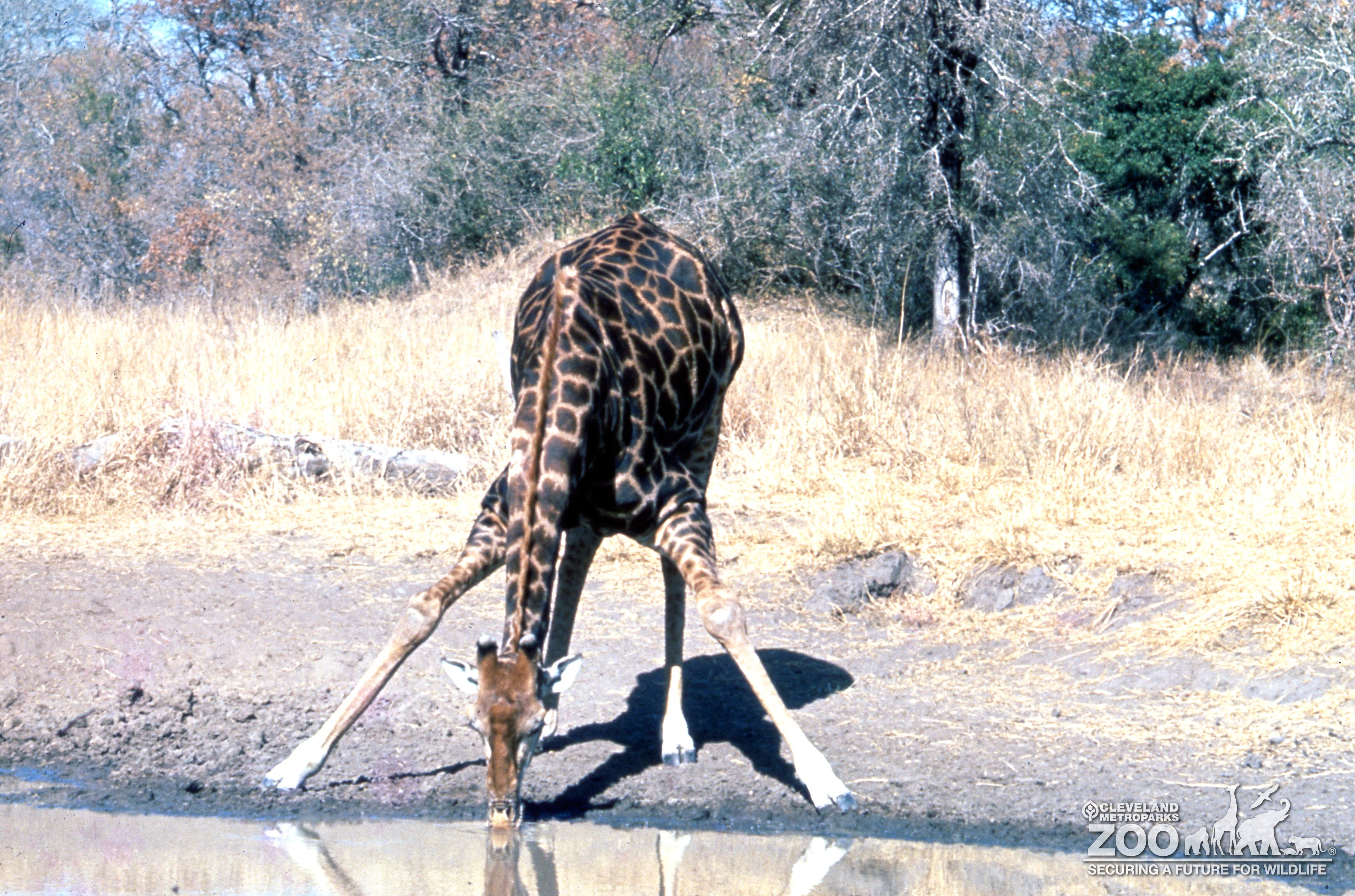 Masai giraffe drinking from a pond. It has it front legs splayed apart to help it get closer to the water. There is low shrubs in the background.