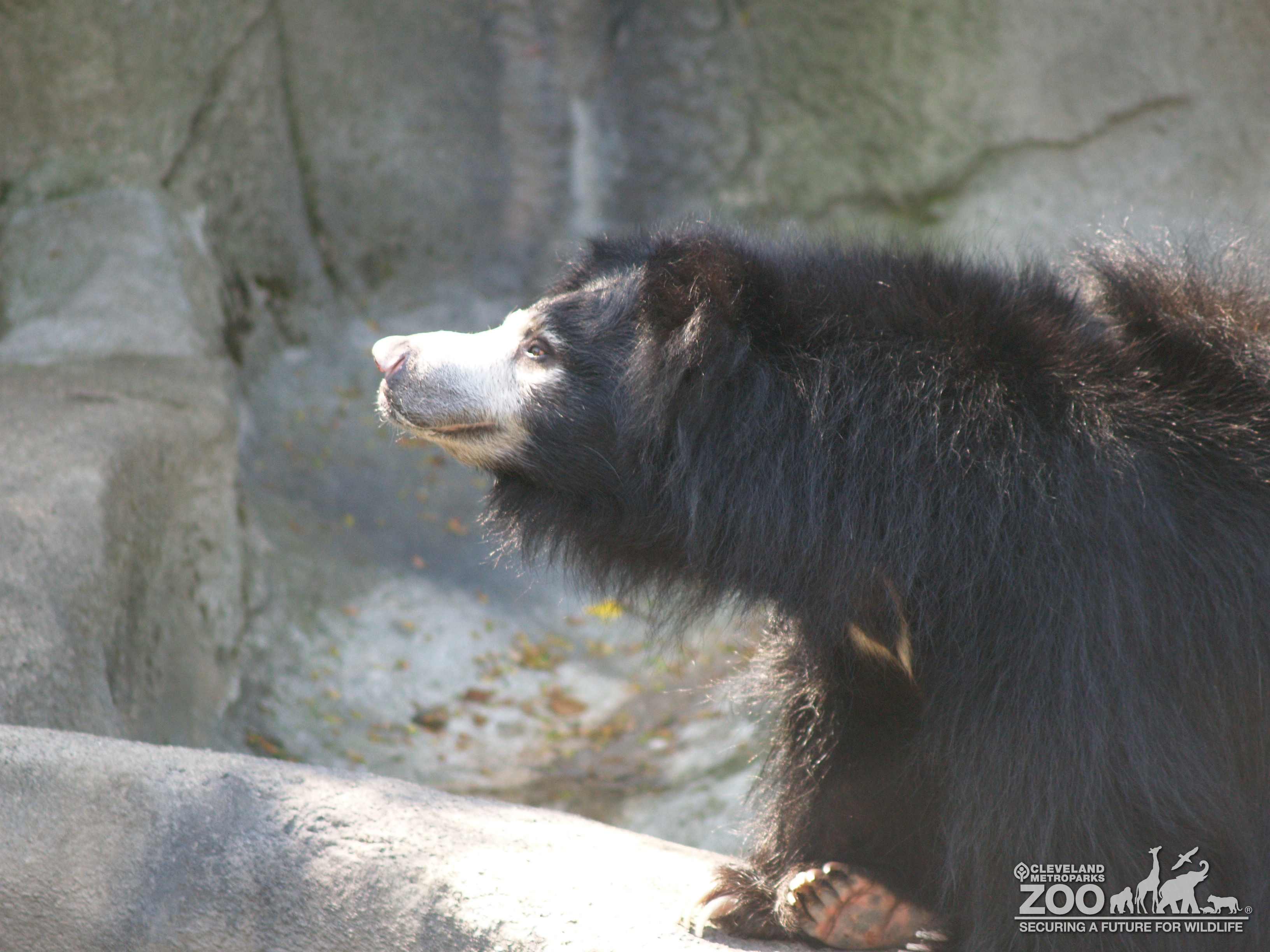 This is a photo of the left side profile of a Sloth Bear that is sitting in its outdoor enclosure sniffing the air. It is sitting with its front paws crossed in front of it next to a grey rock wall. The bear is covered long black fur with light grey fur on its muzzle.
