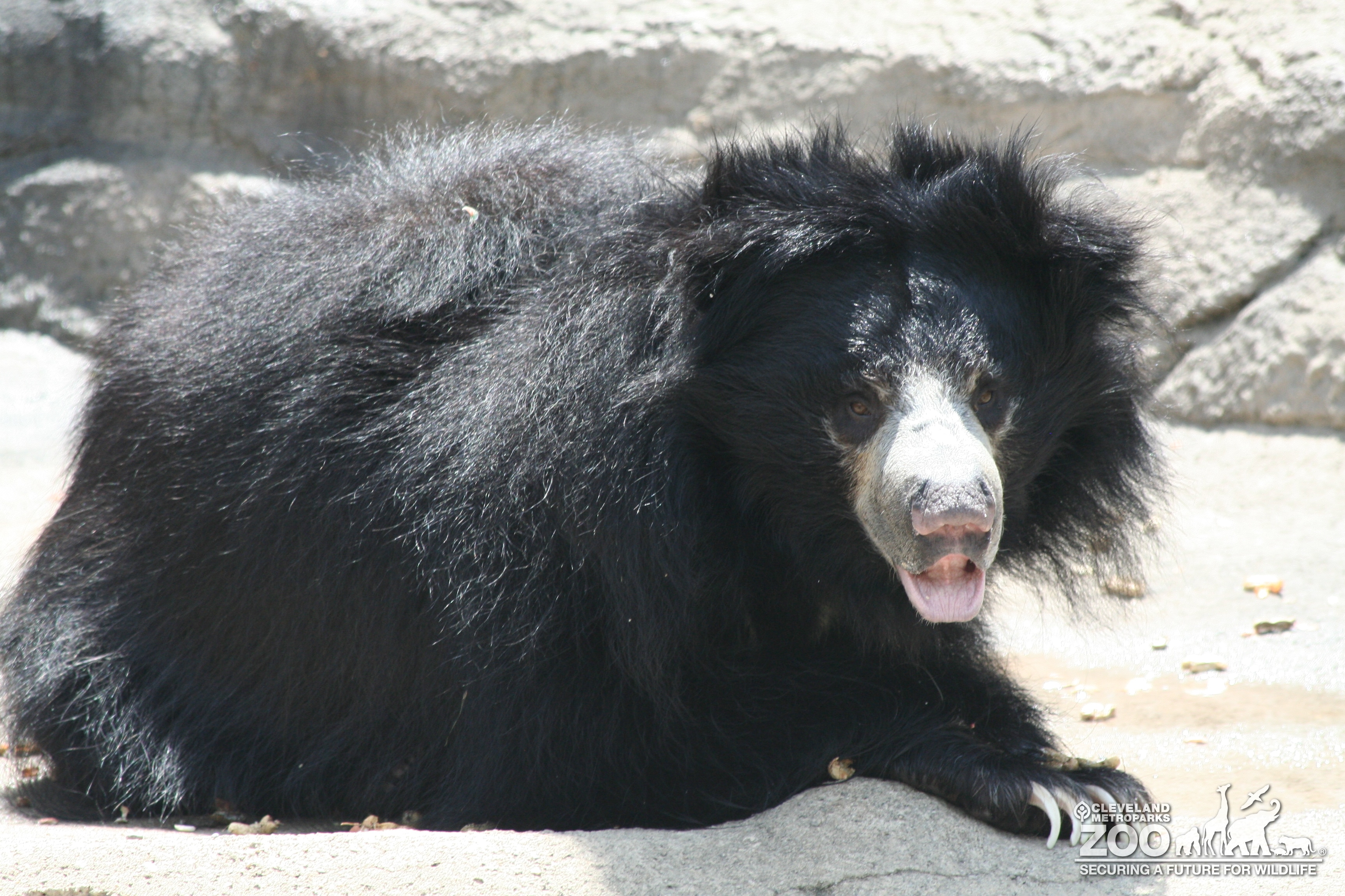 This Sloth Bear is laying out in the sun on the grey rocky ground of its outdoor enclosure. It is looking towards the camera with its mouth open and its lips in a kissing gesture. The bear is covered long black fur with light grey fur on its muzzle.