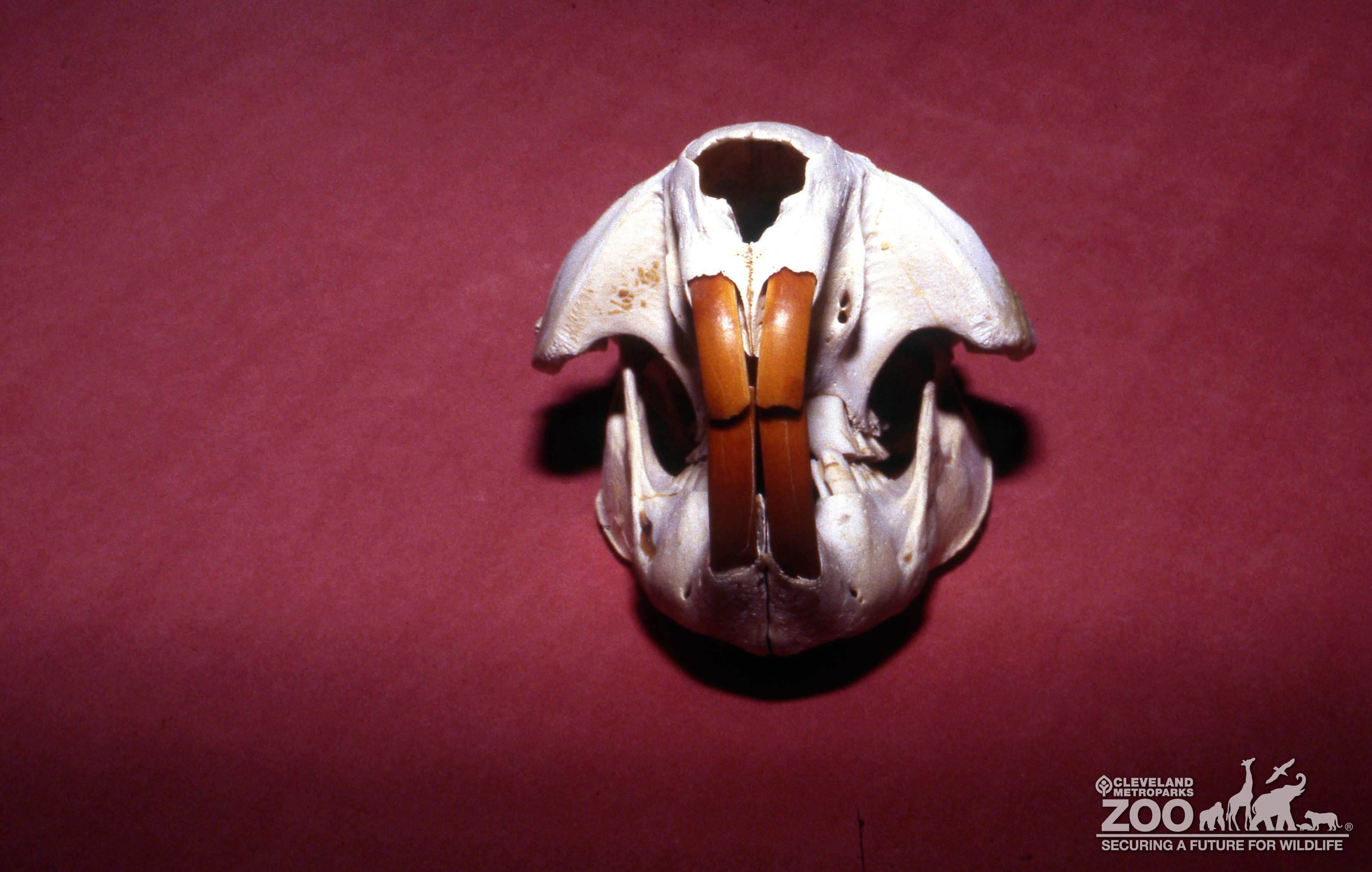 This is a front view of a beaver skull. It is mostly small and white with four long brown curved teeth at the very front of the jaw and a large hole for its nose.