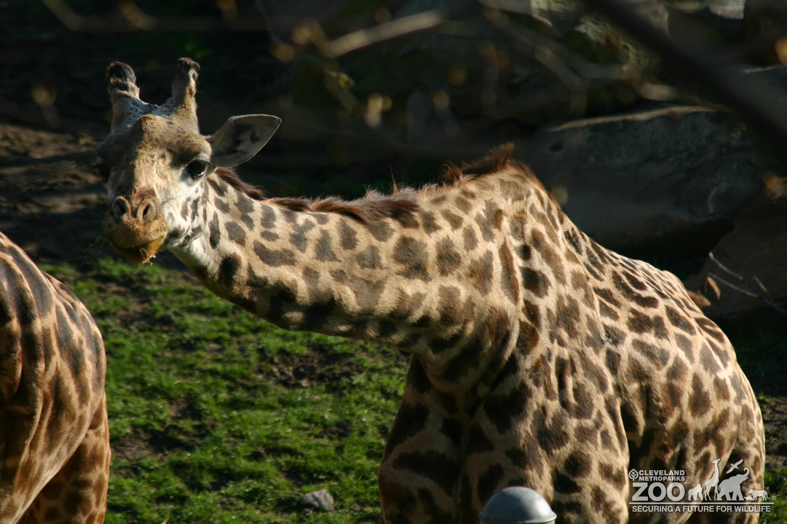 Adult giraffe bending its long neck forward. There are grass and large rocks in the background. The sun is shining on the back of the giraffe.