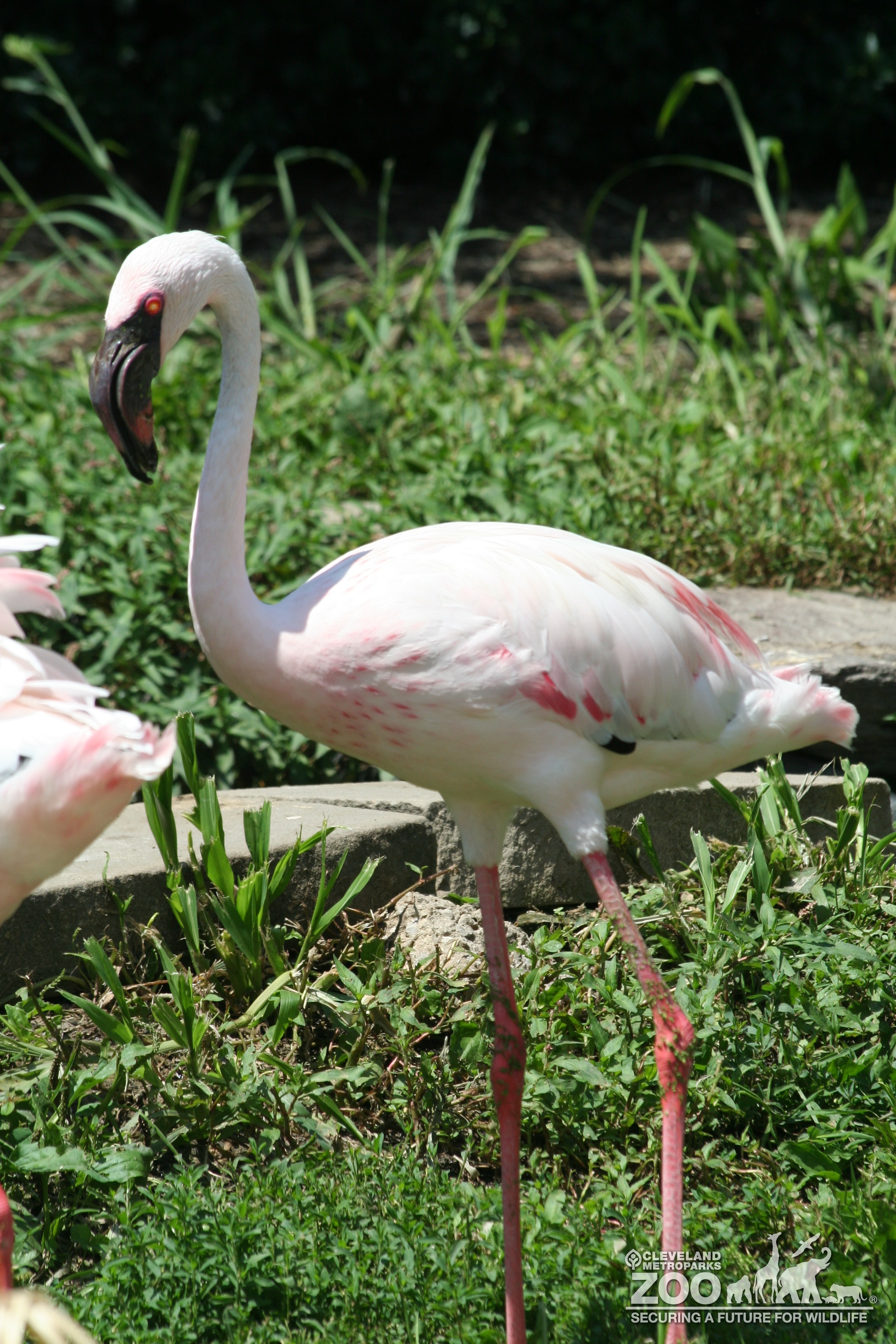 Close up photo of a Chilean Flamingo in grassy area.