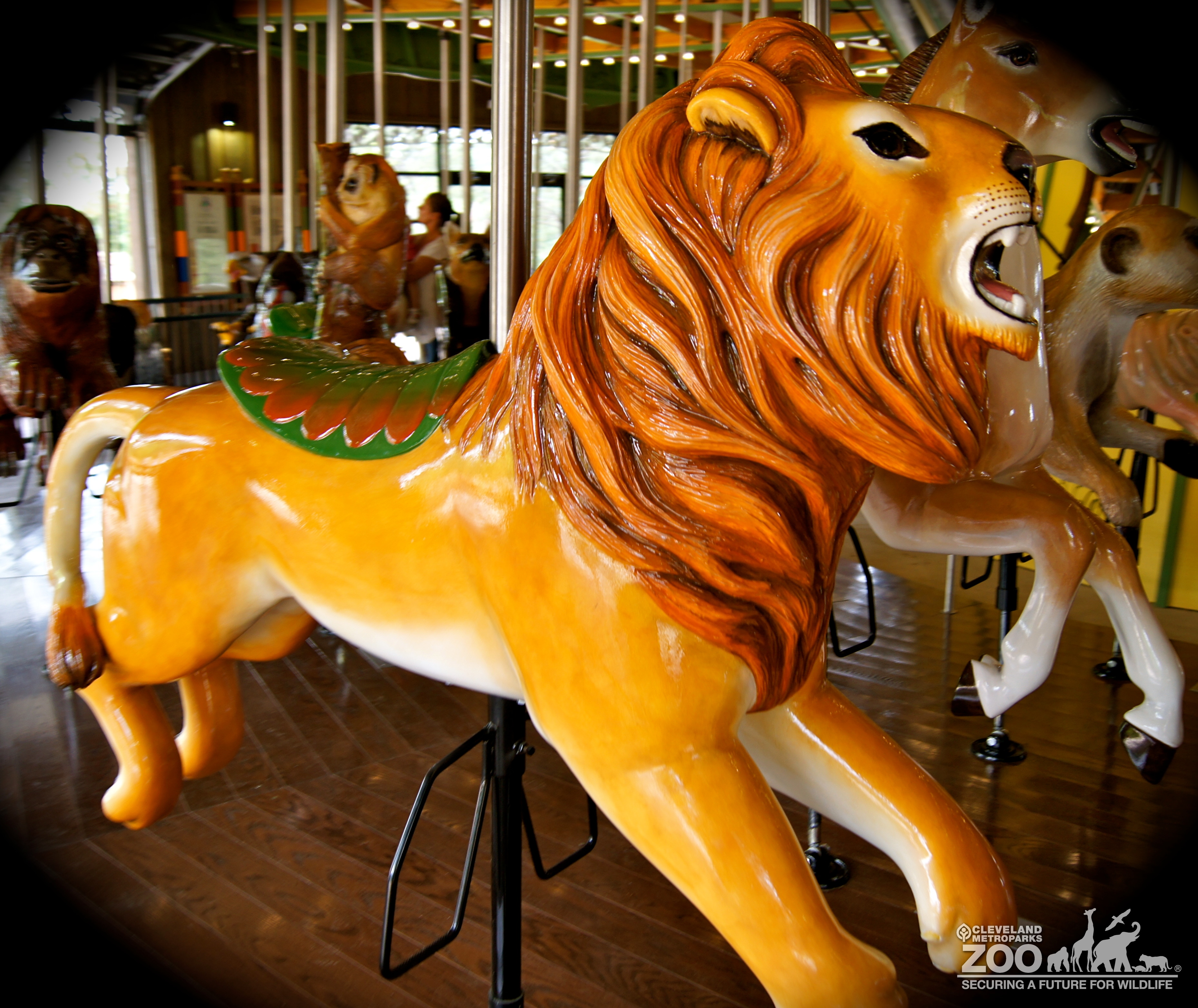 Carved wood carousel lion. Full view of the whole lion that you can sit on during the ride. You also get a glimpse of other animals that are part of the carousel too.
