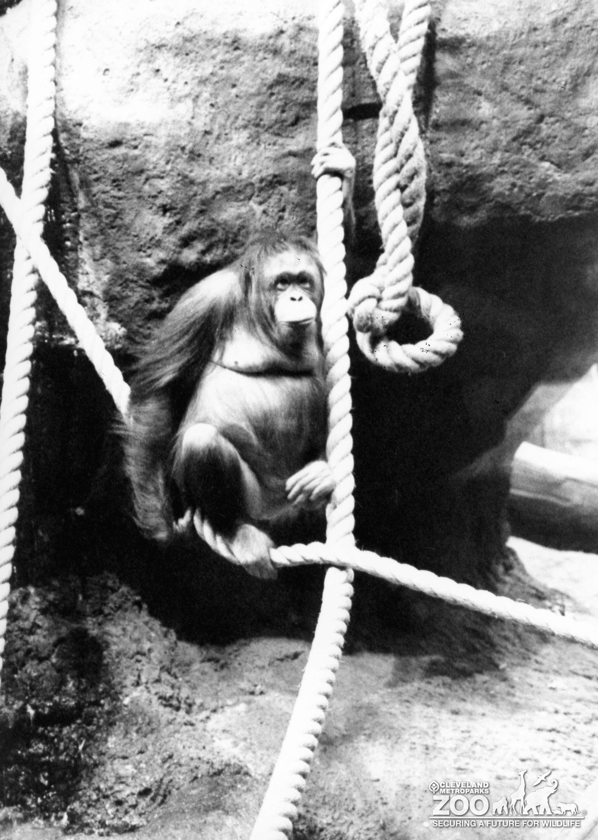 Black & white image of orangutan sitting on exhibit ropes.