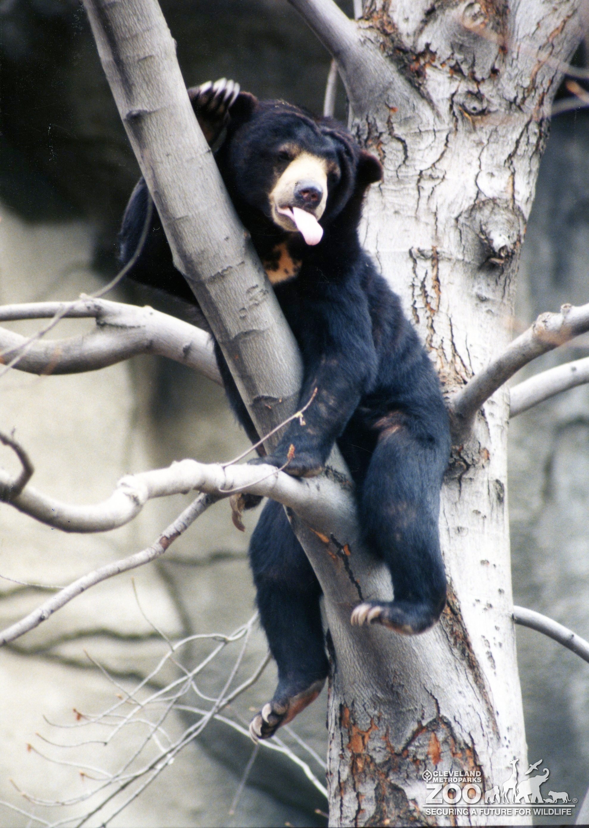 This Malayan Sun Bear is high up in a grey tree sitting on a branch. The bear is looking at the camera with it's tongue sticking out. The bear is covered in short black fur with light brown fur around it's muzzle.