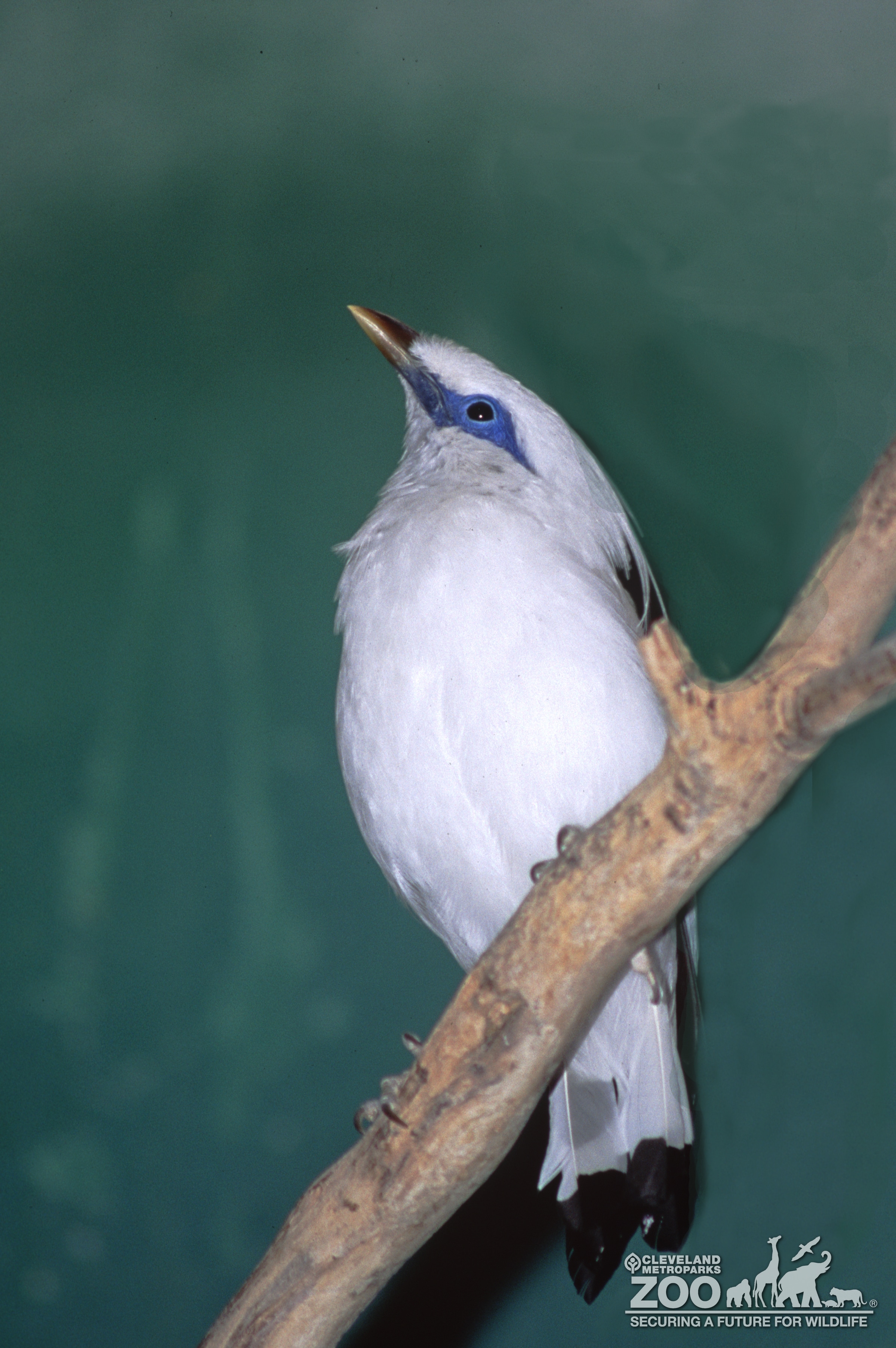 Bali mynah sitting on a diagonal branch. This white bird is highlighted against a blue gray background. Tail feathers are tipped with black.