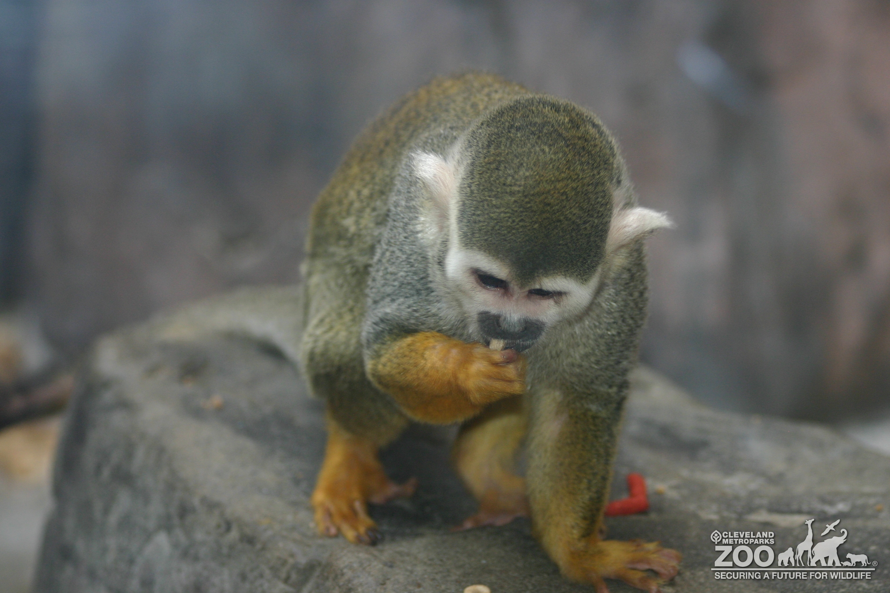 Common squirrel monkey leaning forward eating something in its hand. Monkey has white markings on it face and ears.
