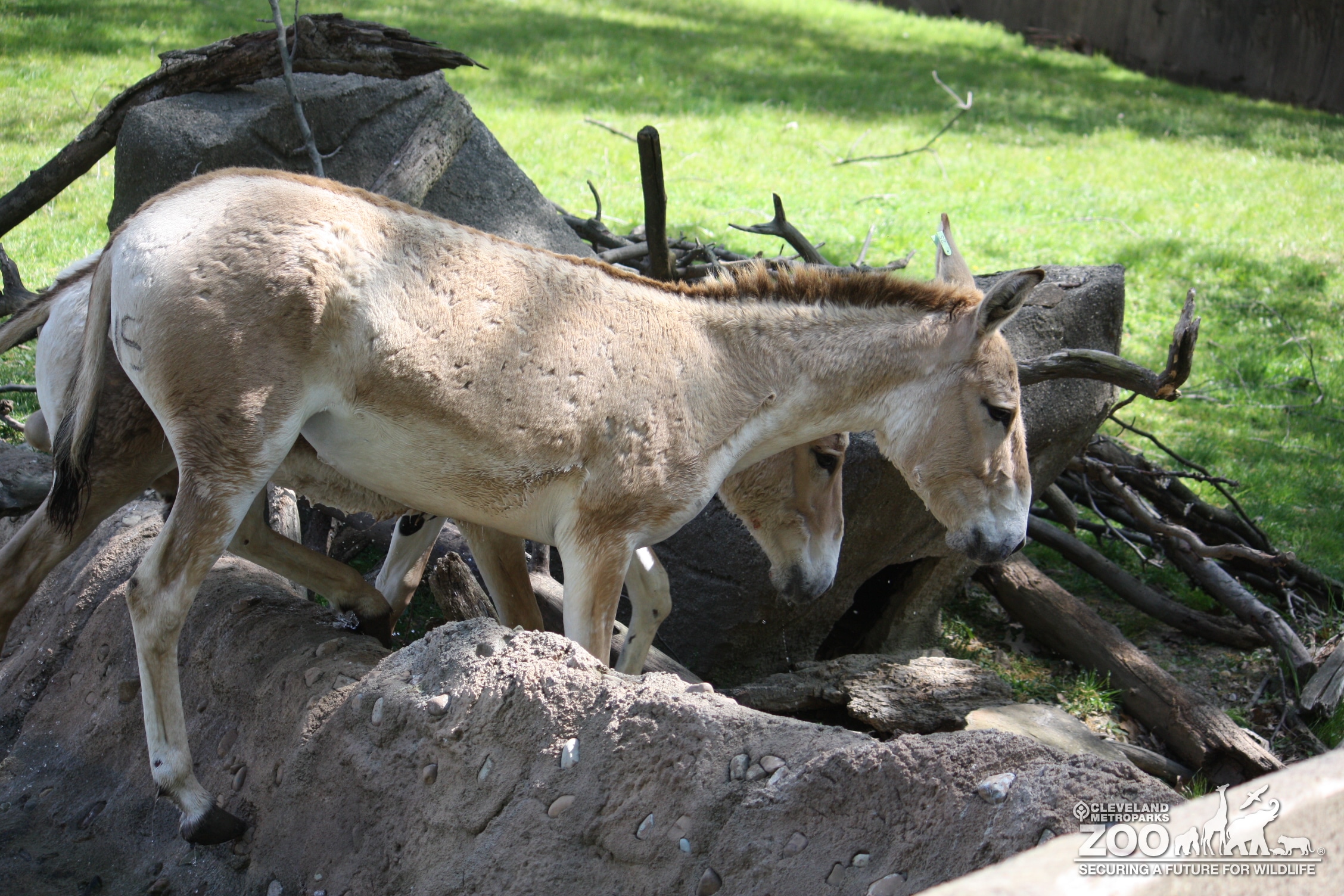 Pair of Persian onager climbing on rocks in outdoor habitat. Equine are dusty tan in color. Large ears like donkeys.