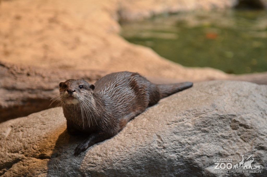 Asian small-clawed otter sitting on a rock after a swim. The animals sleek brown fur is still wet from swimming. It has soft brown eyes. Shot was taken in The RainForest.