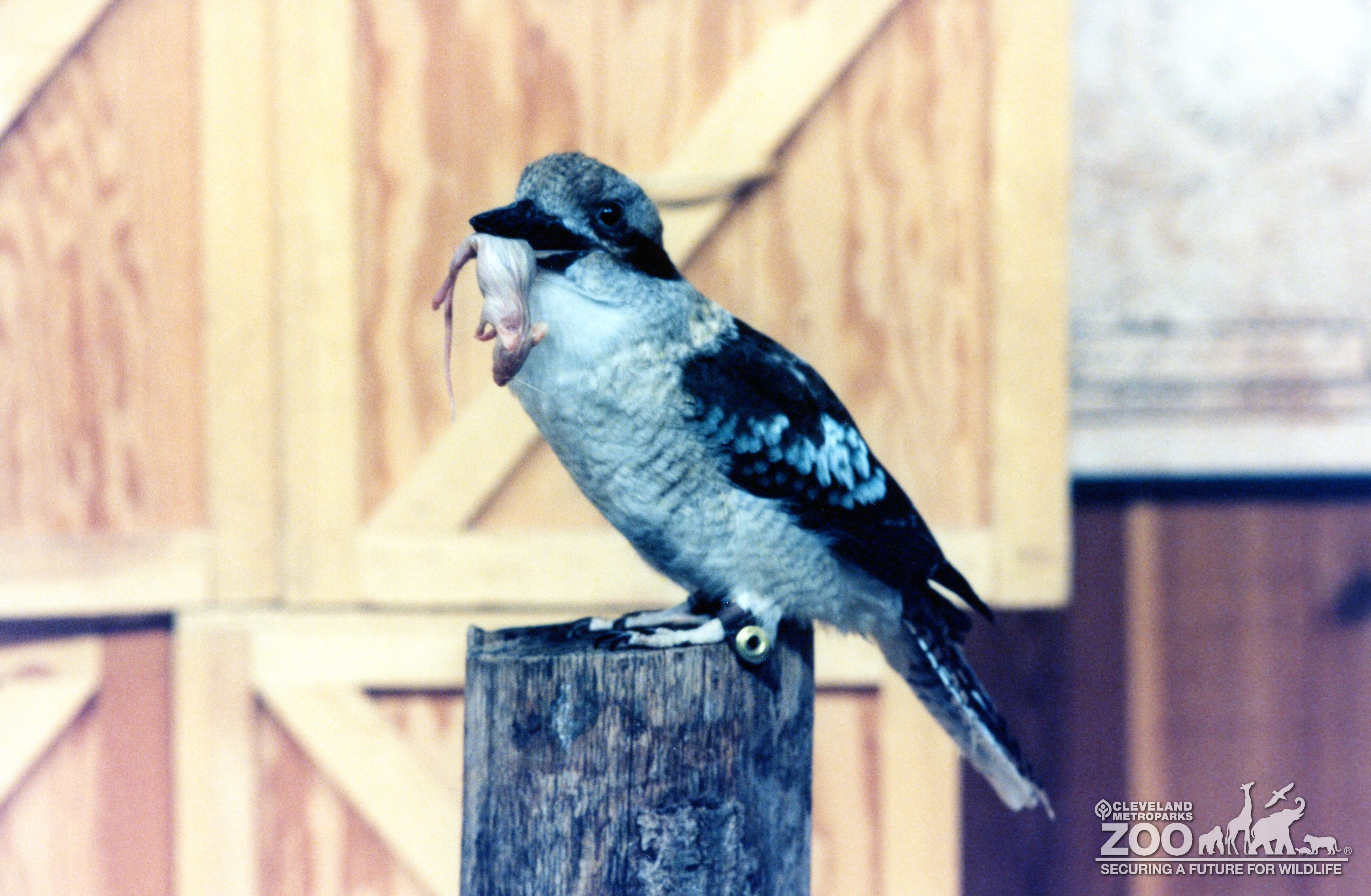 Kookaburra sitting on a stump eating a whole mice. The bird is outside and crates are in the background.