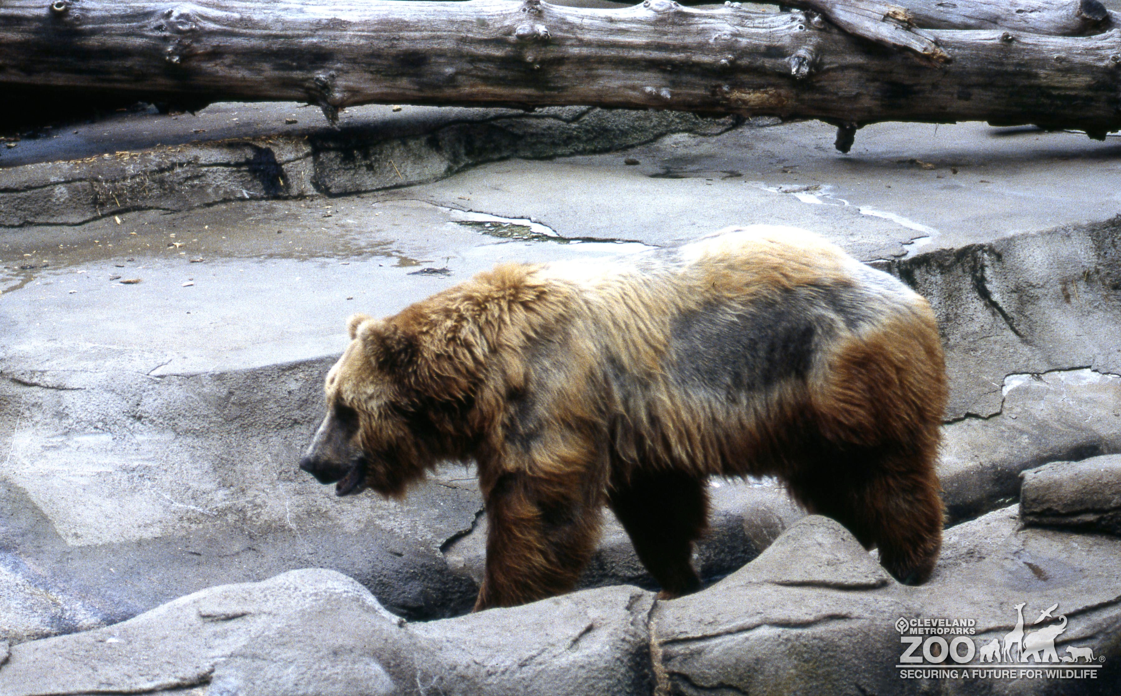 This is a photo of the left side of a large adult Grizzly Bear standing in it's outdoor enclosure. In the background is a large brown tree trunk is laying on it's side surrounded by the grey rocky walls and cliffs of the enclosure. The bear is covered fur, it has reddish brown fur on it's legs around it's neck, it also has blond fur down it's back and on it's forehead.