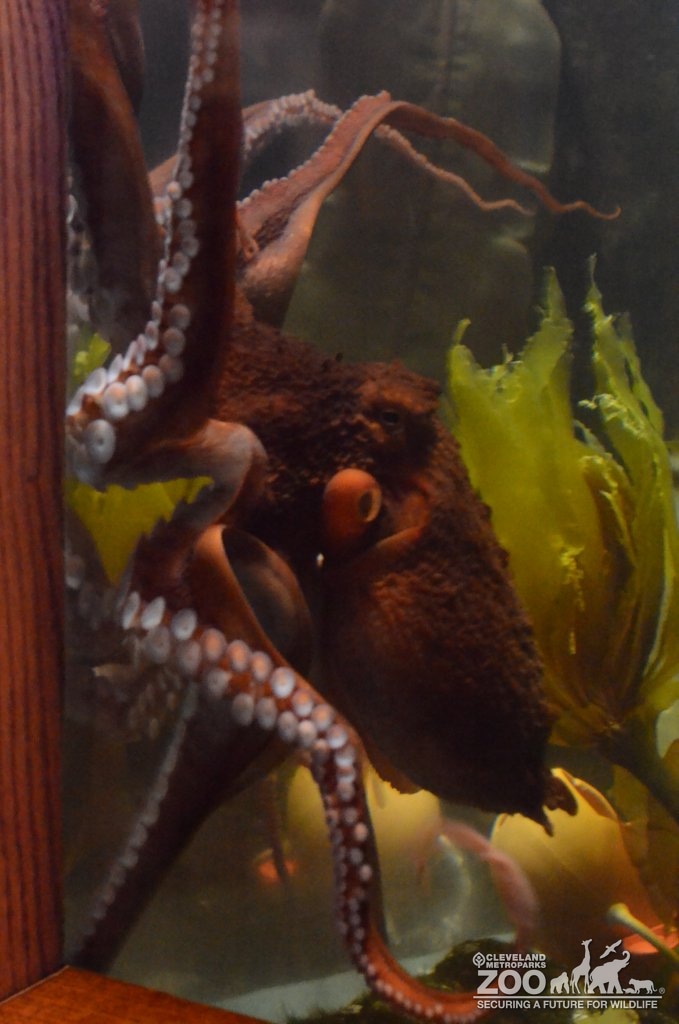 Giant pacific octopus moving in tank. View is of large body and tentacles and suckers. Body is pinky rust color.
