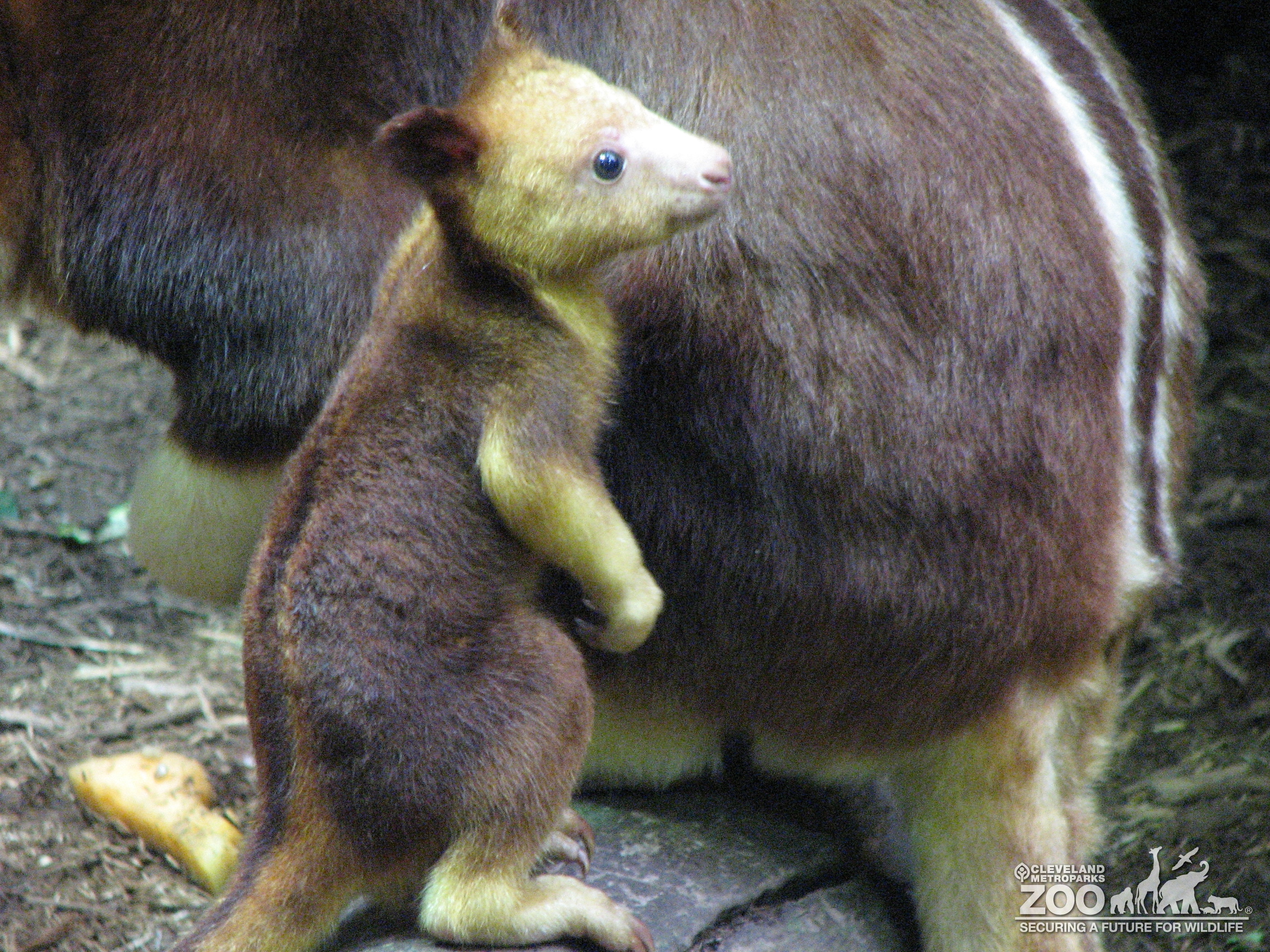 Goodfellow's tree kangaroo adult and joey. Joey is looking to the right. Animals are outside in the walkabout.