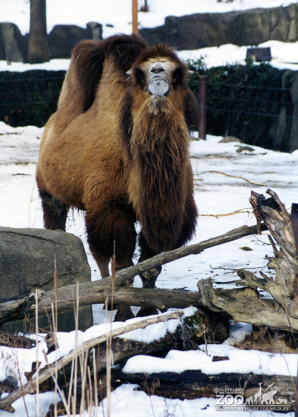 A Camel standing on the white snow covered ground of its outdoor enclosure. From its head to the two large humps in middle of its back, the camel is covered in dark brown fur. On its face the camel has shorter brown and white fur.
