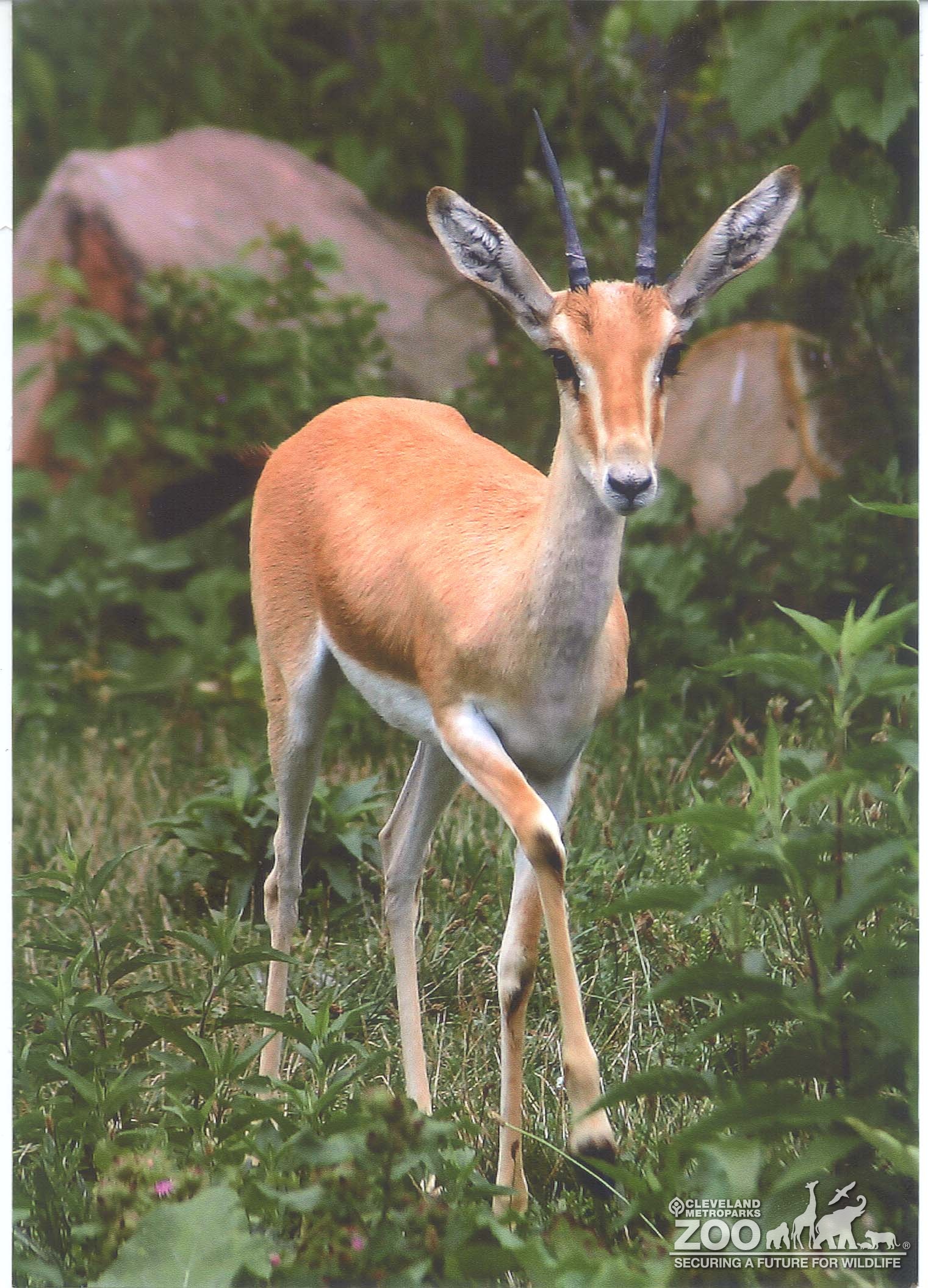 The slender-horned gazelle is outside walking forward. One of the gazelle front leg is up and in a walking motion. It is a light brown color similar to a fawn. The inside legs and under body are white. The horns sit on top of its head and twist outward. They are pointed at the ends and black. It has large dark eyes. There is lots of green plants and grass around the animal. There are large boulders in the background.
