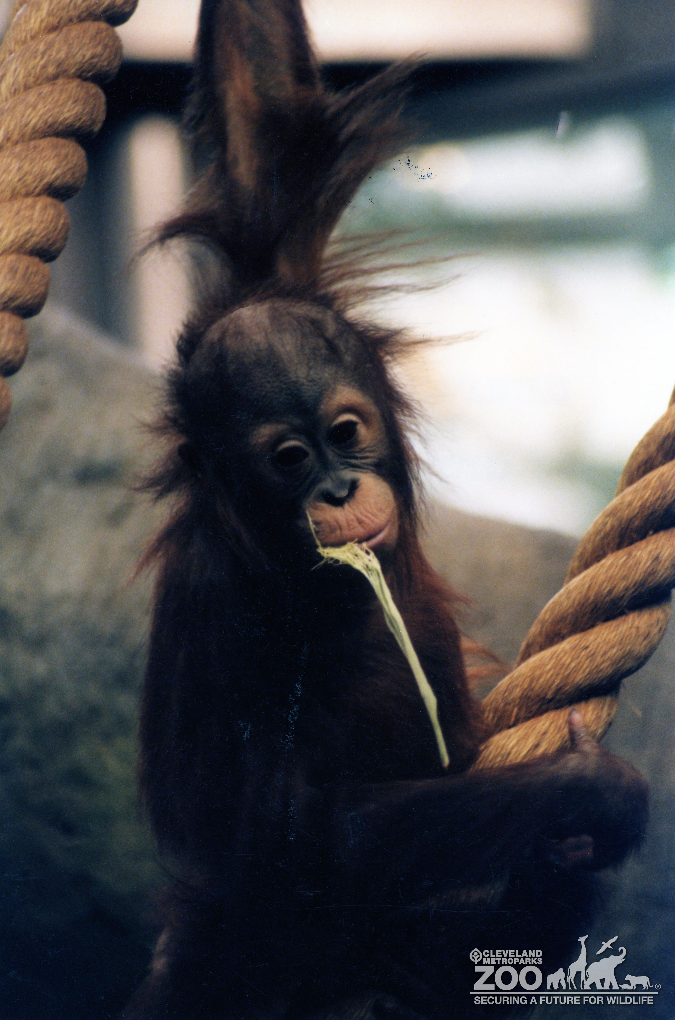 Young orangutan hanging on a large rope in The RainForest. Primate is looking over its shoulder and has a leaf sticking out of its mouth. Hair is disheveled on head.