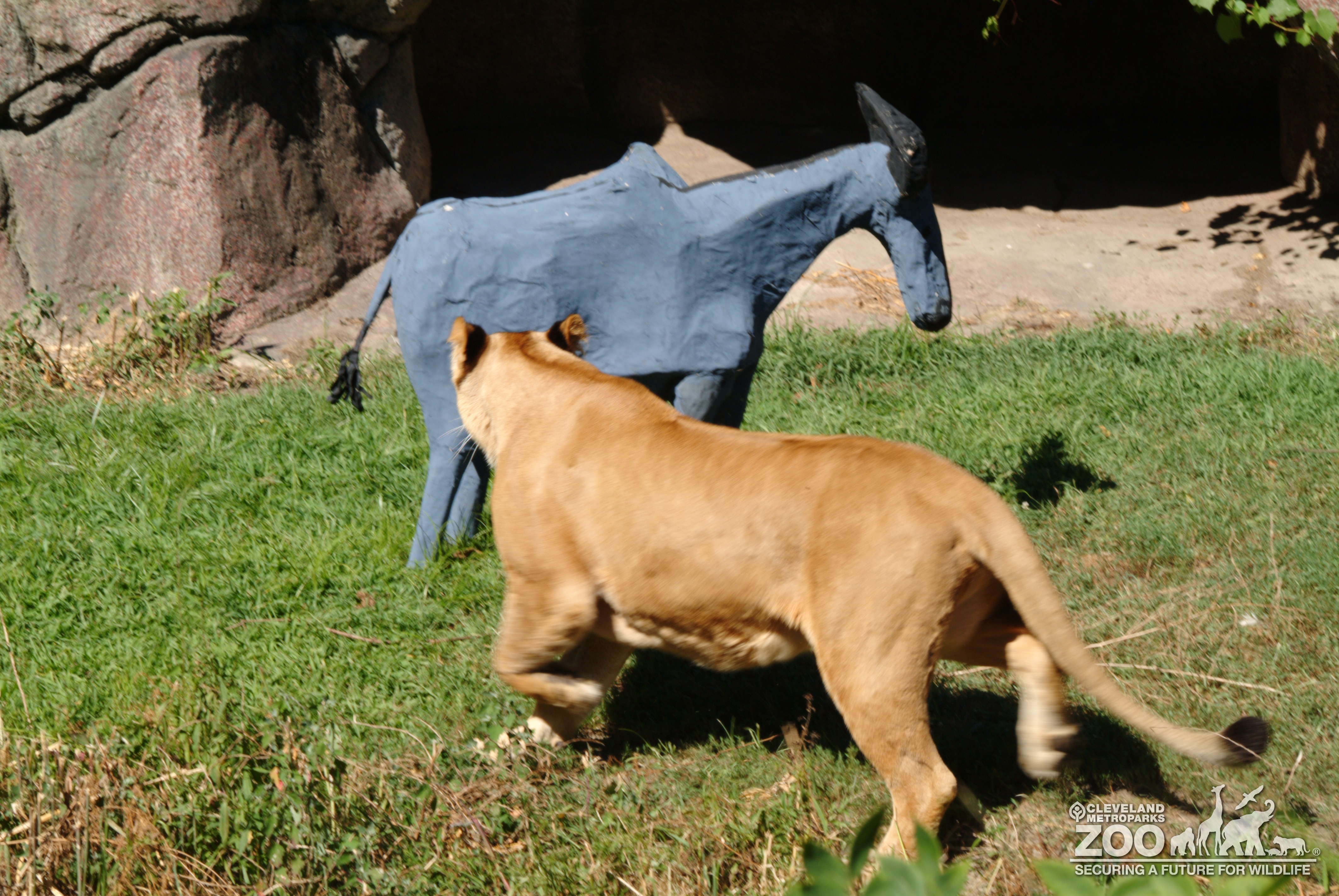 Lioness with shades of brown faces and circles gray paper mache gazelle enrichment item in habitat.