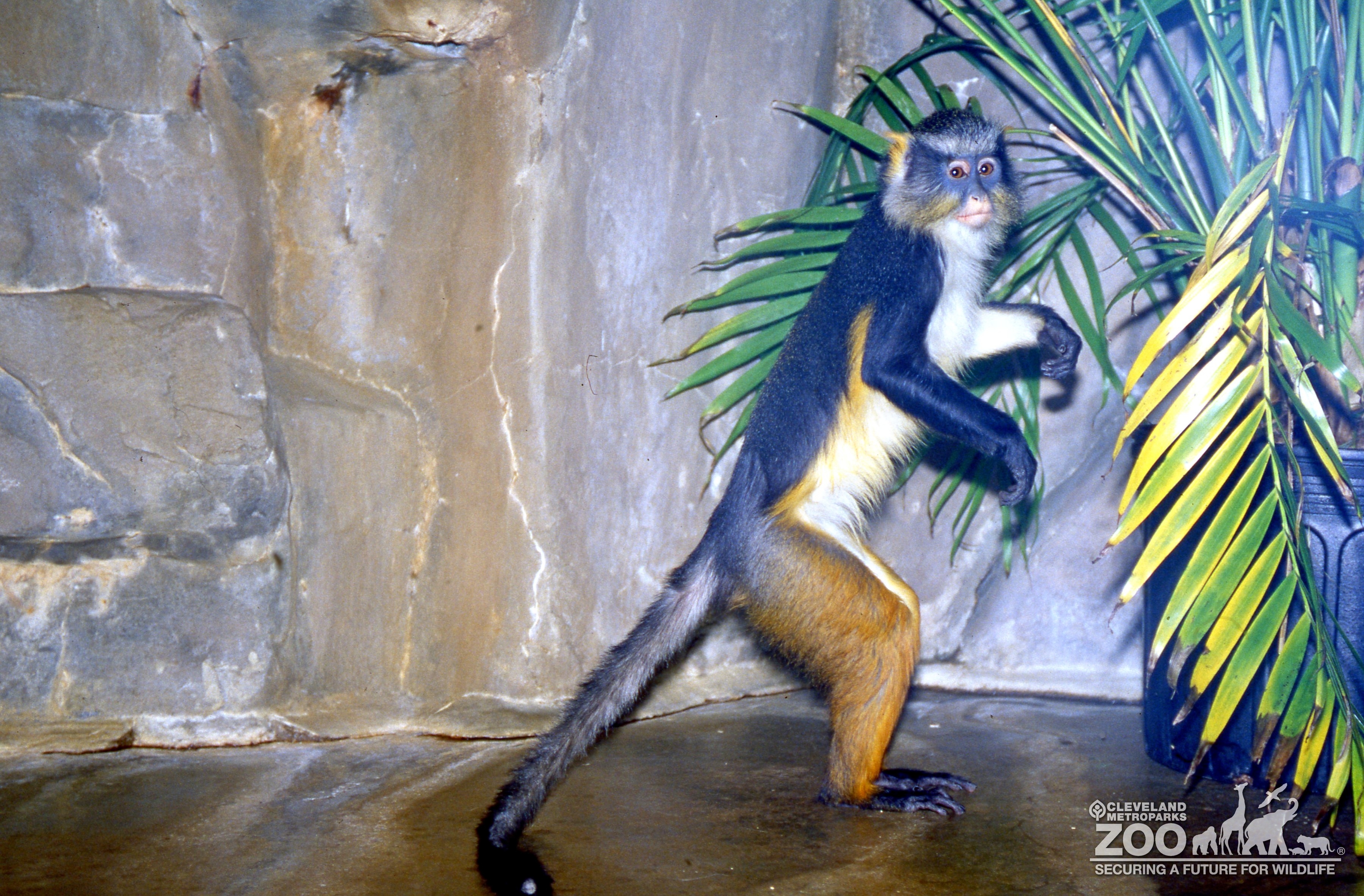 Wolf's guenon standing on hind legs inspecting a palm plant. Long tail and tri-colored fur is visible. Background is man made rock wall.