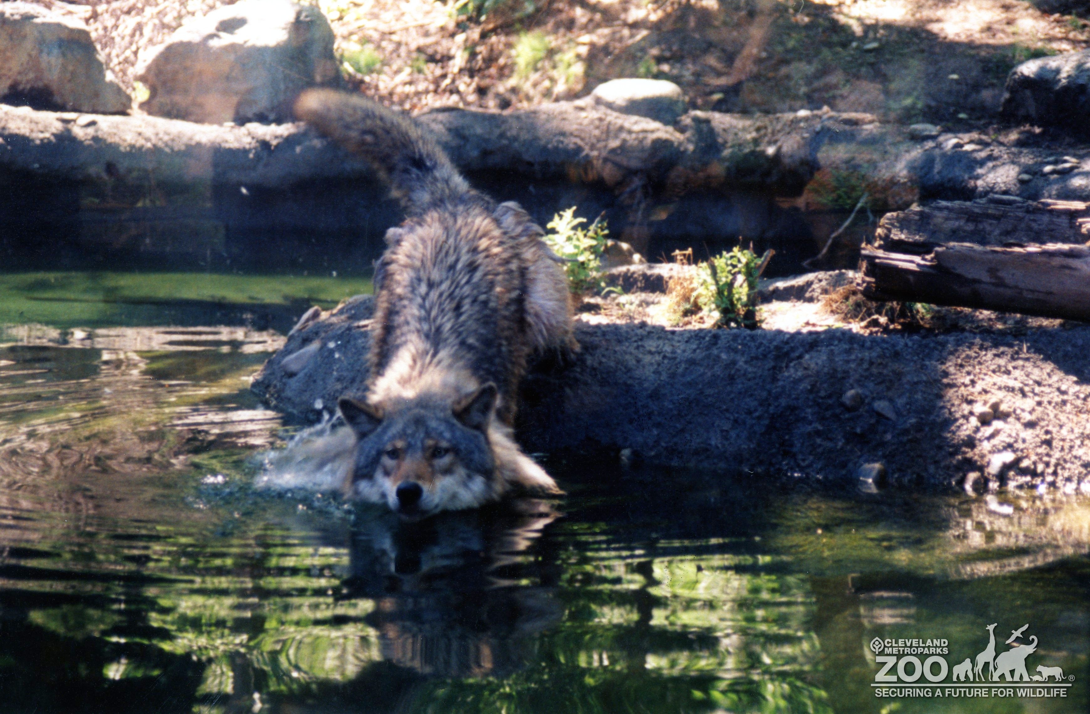 Photo shows a Mexican Gray Wolf entering a body of water.