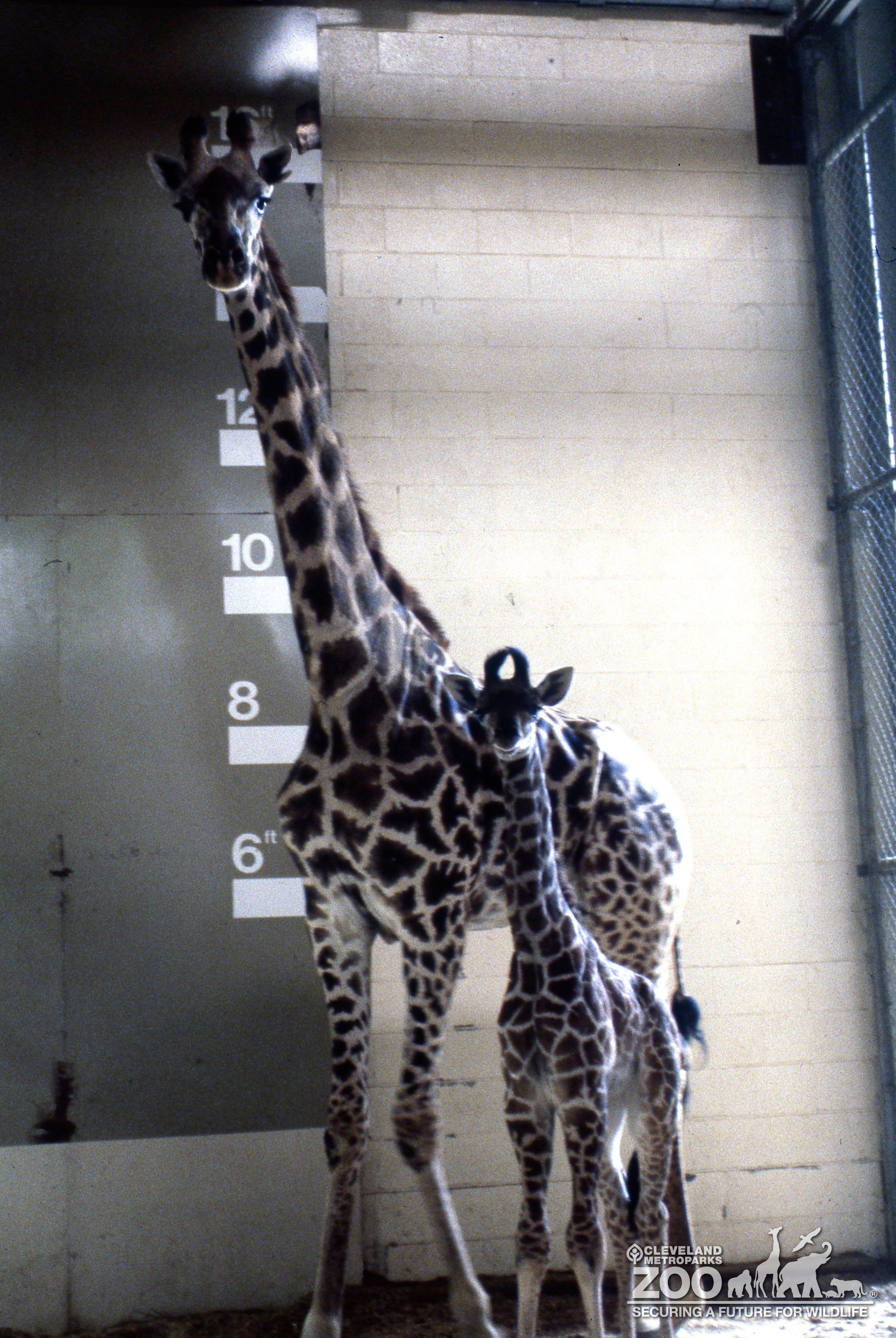 Black & white image of Masai giraffe mother and infant standing in the giraffe barn. There is a scale painted on the back wall measuring feet in two foot increments. This provides a visual reference for the keepers to measure the height of the giraffes while they stand in their stall.
