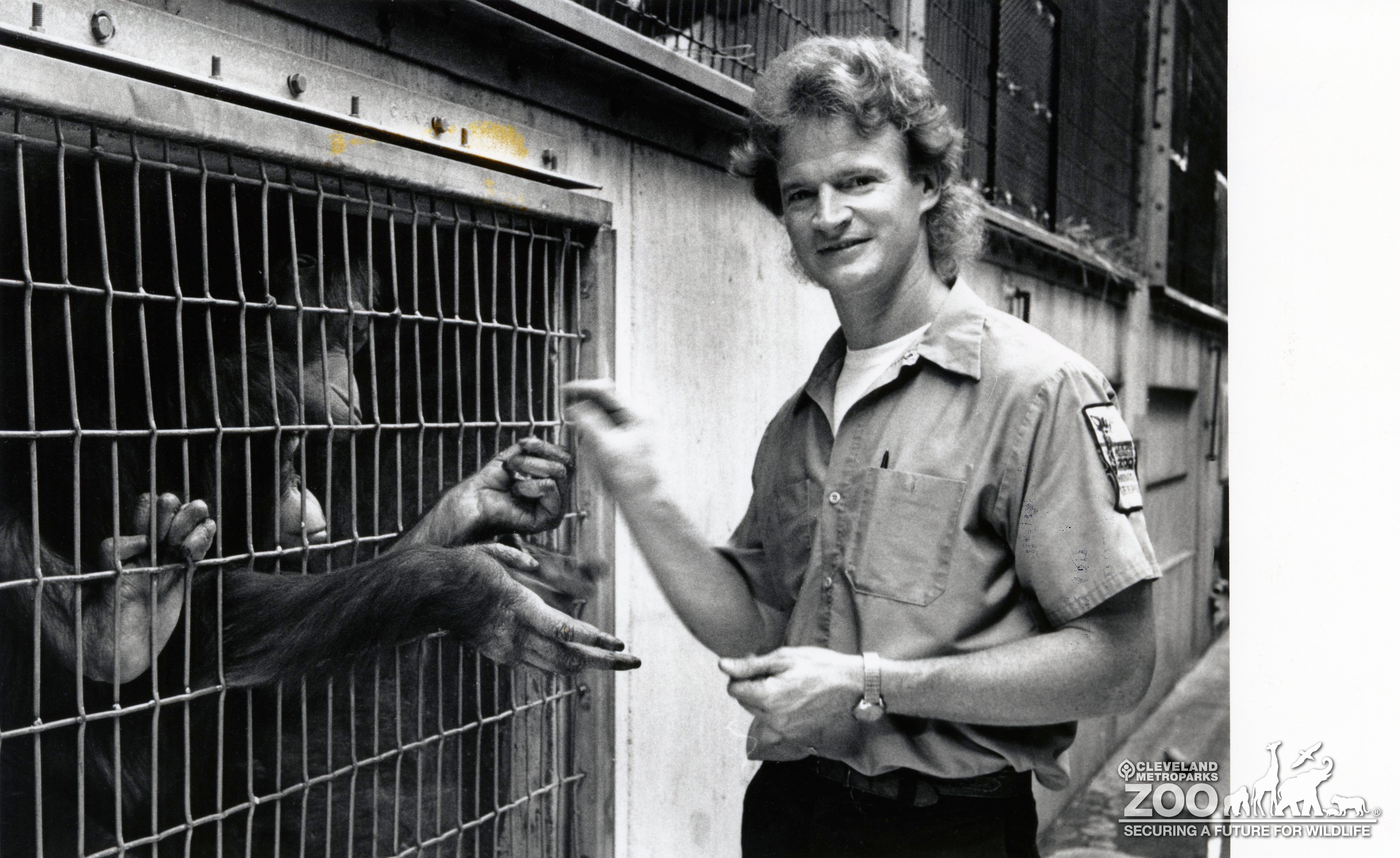 Black and white image of keeper, Tad Schoffner (?), with orangutan at barrier. Keeper has on uniform shirt that has old logo with giraffe from the 1980s.